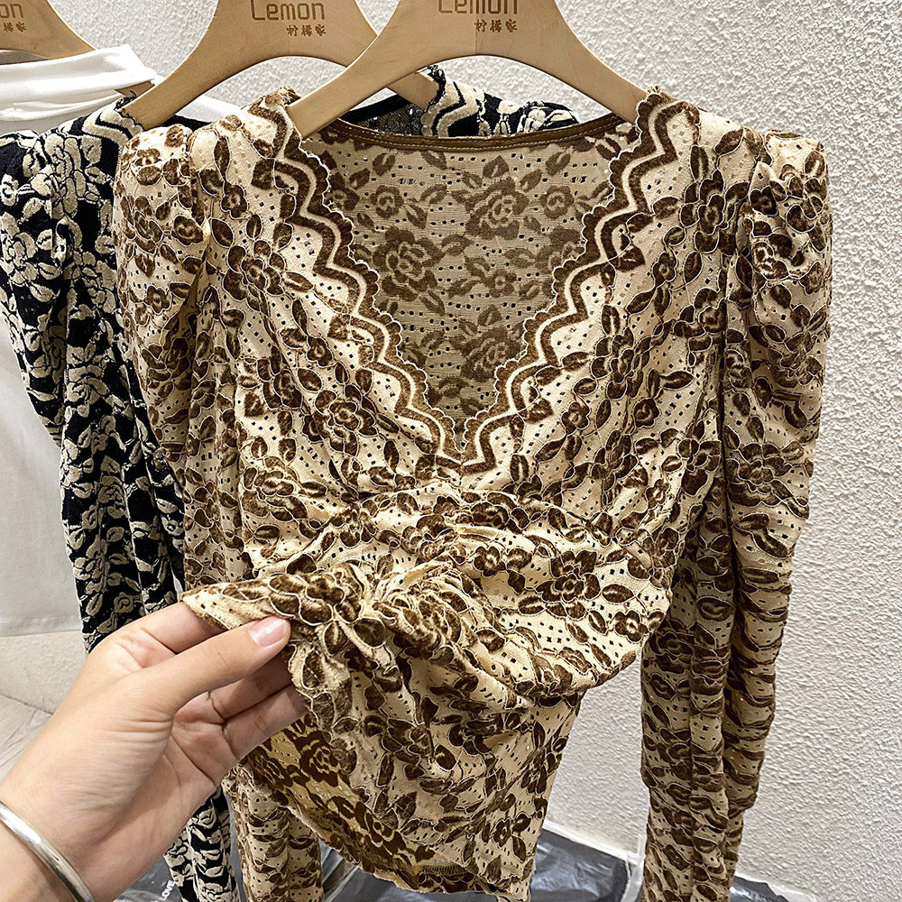 2023法式气质V领衬衫女秋季设计感小众高级感泡泡袖修身打底上衣