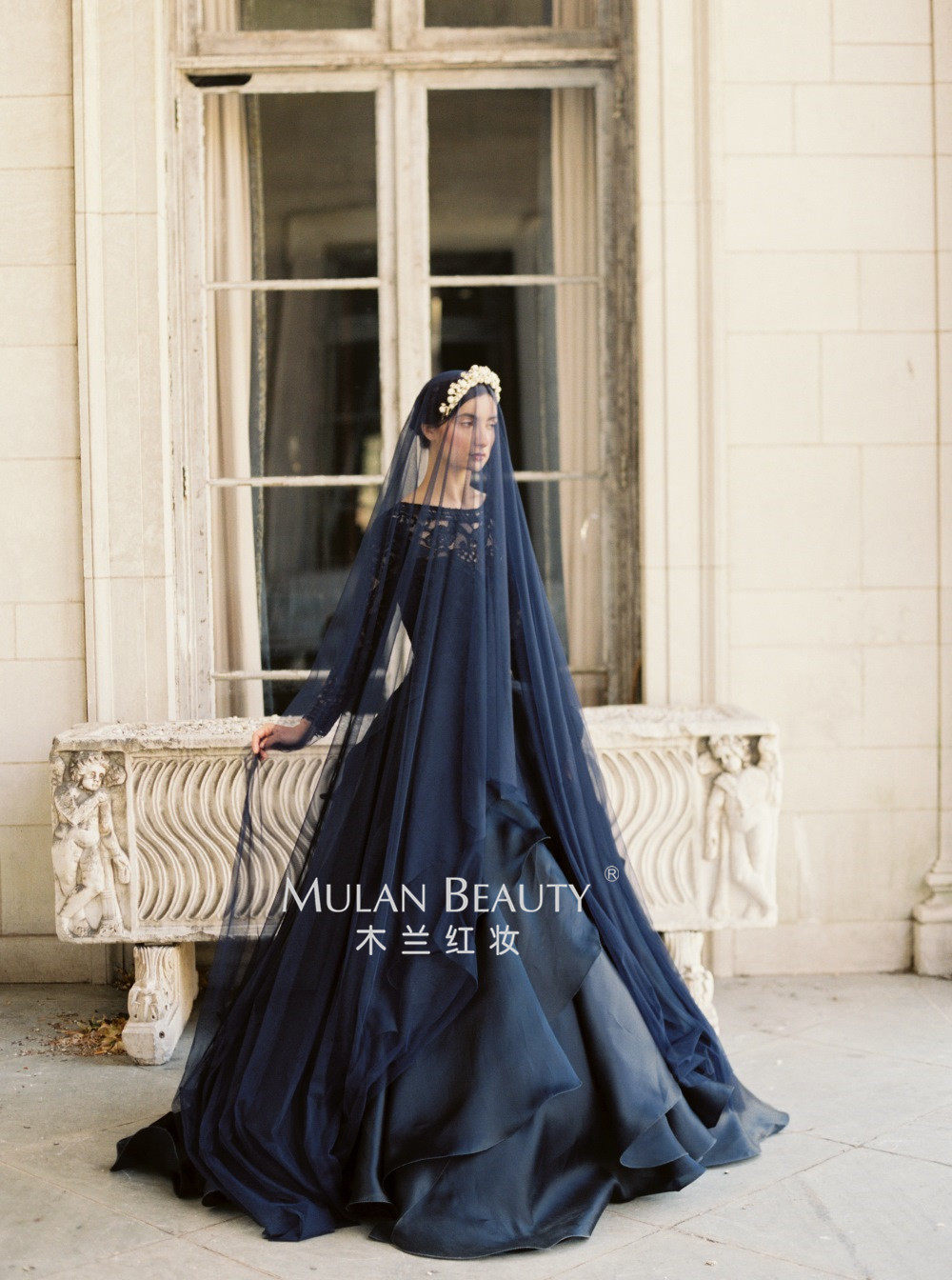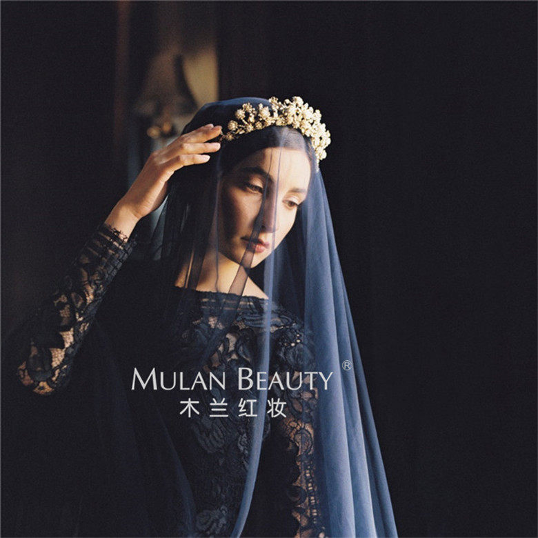 淘宝木兰红妆,欧美新款藏青色软网纱摄影造型头纱,飘逸加密软网