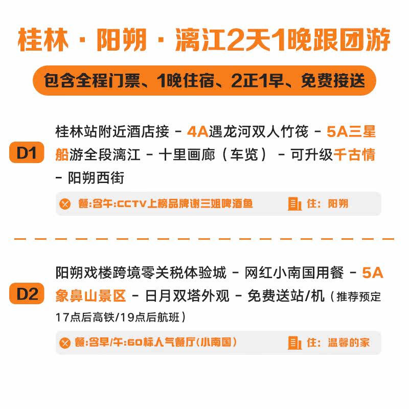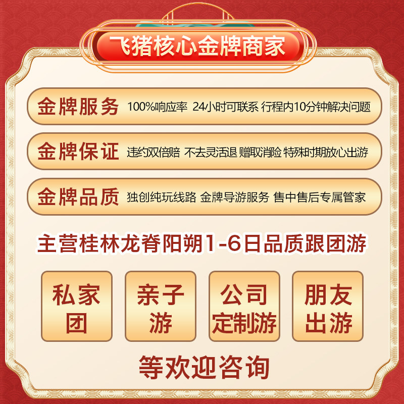 天猫4800979594231616657,桂林旅游漓江阳朔漂流遇龙河竹筏,【美味大餐】:赠送60元高餐标桂系风味菜 +30元阳朔特色啤酒鱼宴 【星级酒店】:保证入住阳朔,感受山水小城夜生活,高档豪华多酒店可选 【暑期升级】:漓江三星船 错峰少排队 遇龙河双人漂流 可升桂林千古情 【品质保障】:品质旅游20万责任险,超值升级体验,赠送桂花糕伴手礼