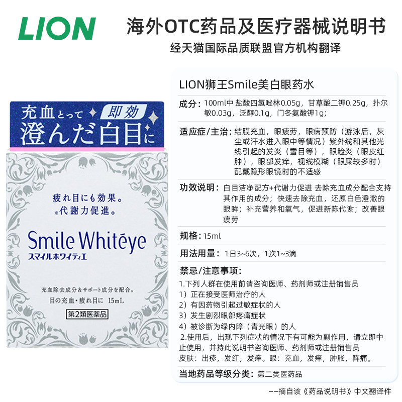 天猫阿里健康大药房海外店,日本进口lion狮王smile whiteye美白眼球滴眼液眼药水养眼护眼,日本进口正品保证消除红血丝清澈眼白