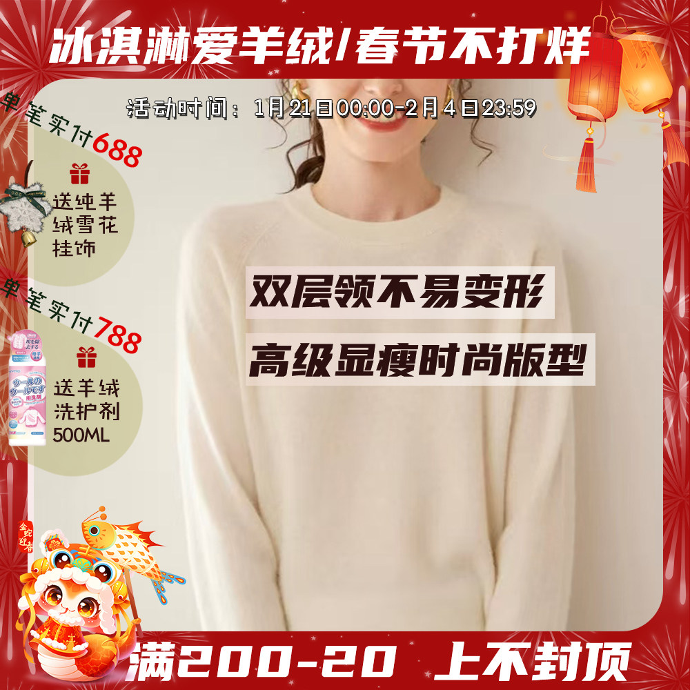 淘宝冰淇淋爱羊绒,圆领100%纯山羊绒衫女纯色显瘦宽松通勤套头针织打底衫经典百搭款