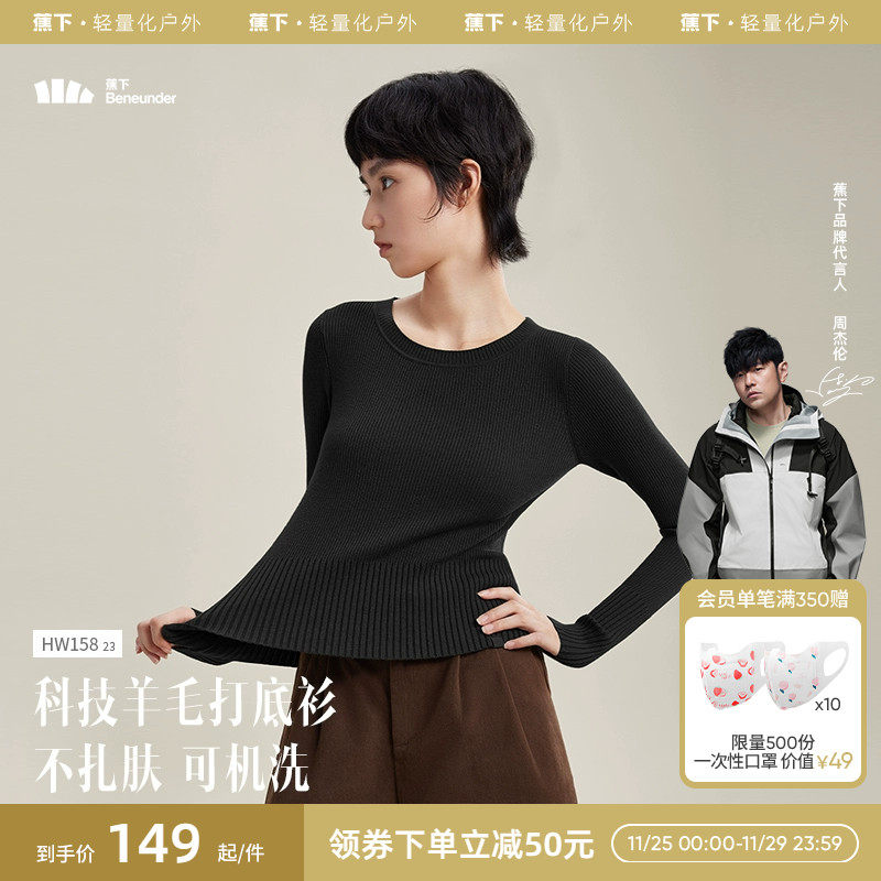 天猫蕉下官方旗舰店,蕉下科技羊毛打底衫女HW15823秋冬内搭 针织衫圆领可机洗黑色毛衣