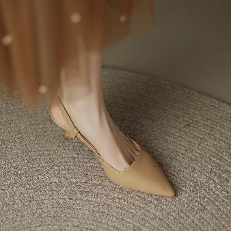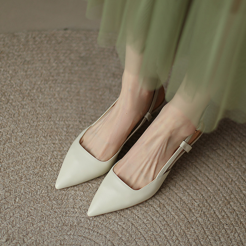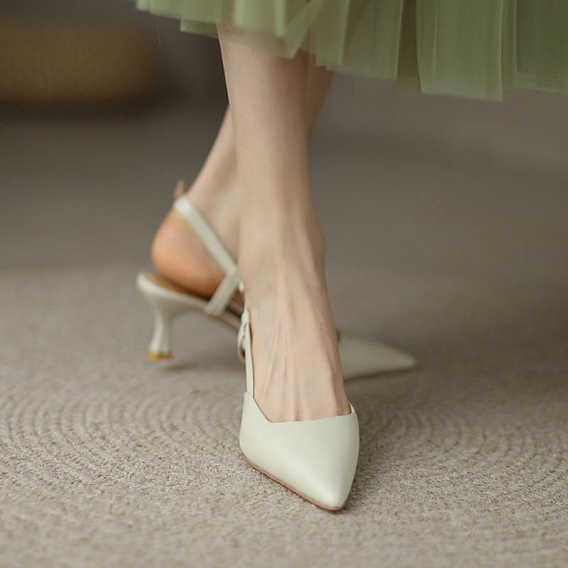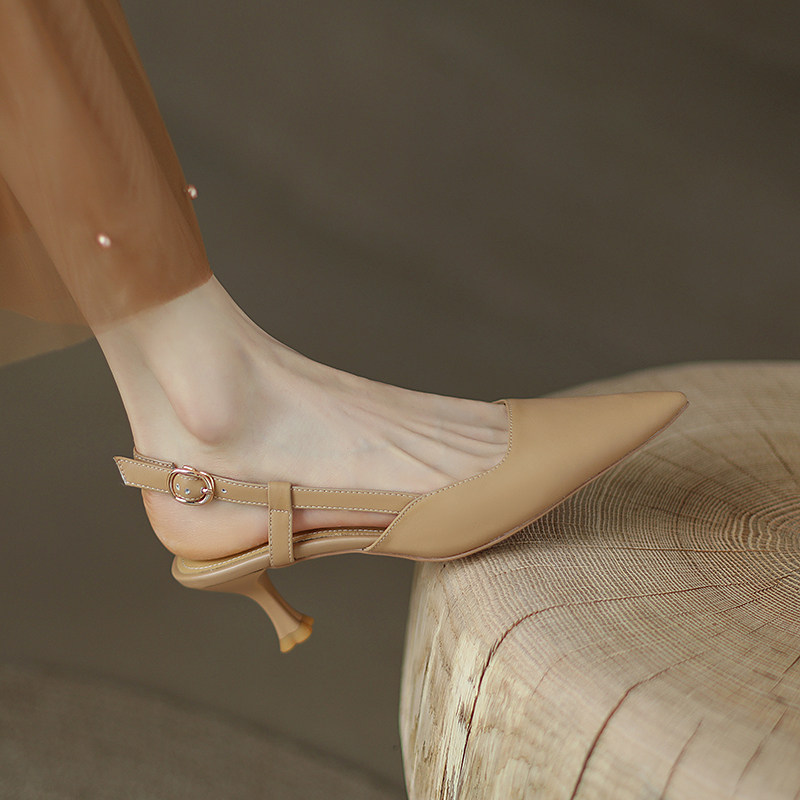 2023夏季新款杏色尖头浅口后空单鞋包头凉鞋女细跟真皮气质高跟鞋