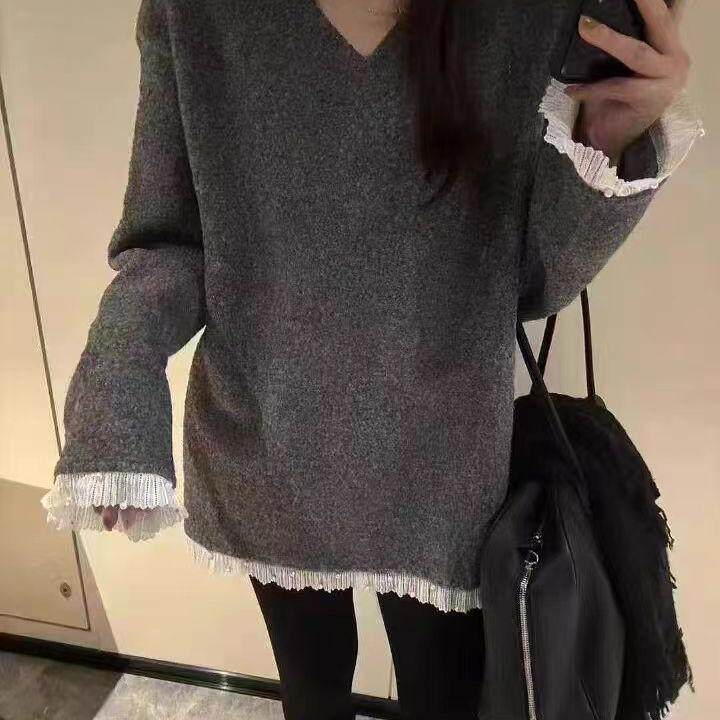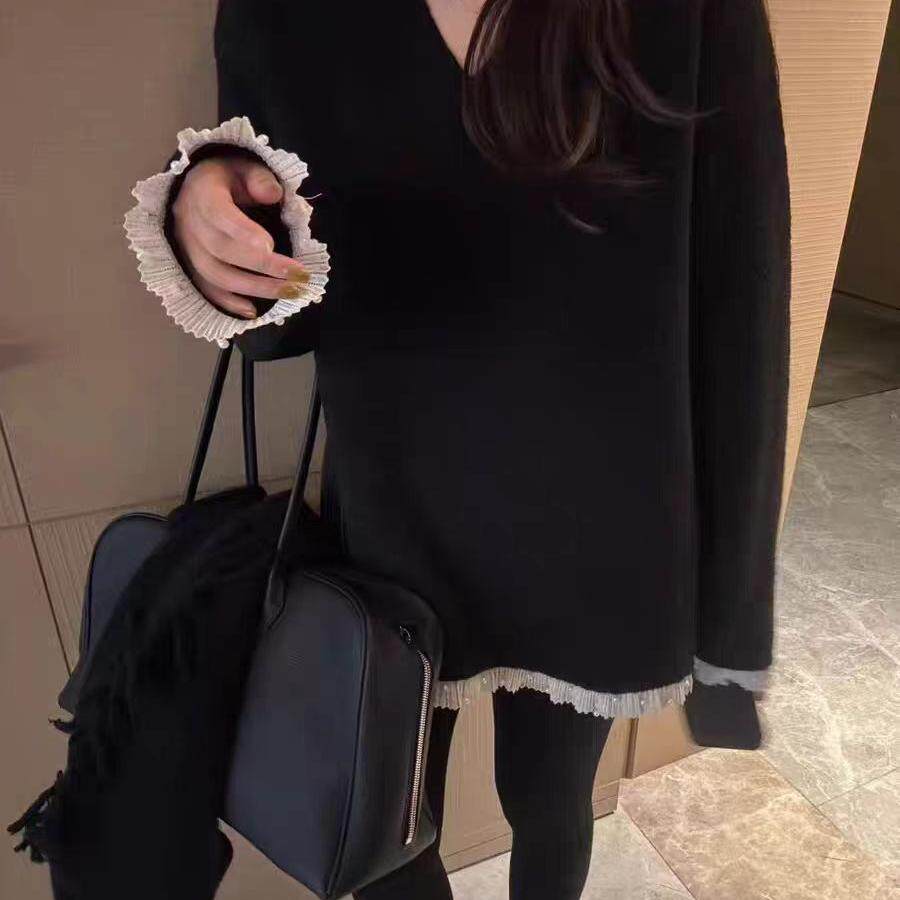 新年红色蕾丝花边V领毛衣女秋冬新款宽松慵懒风中长款打底针织衫
