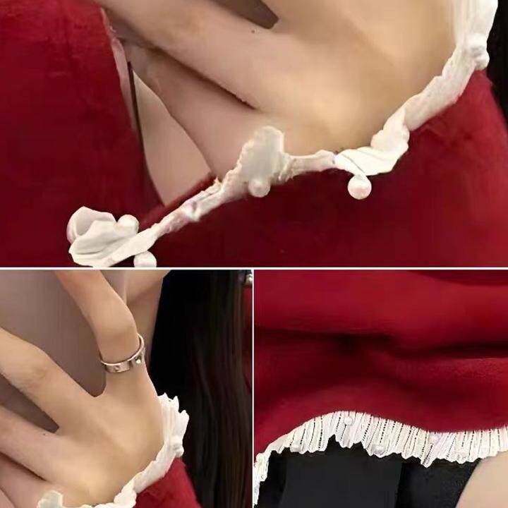 淘宝Qearl 设计师原创衣橱,V领套头蕾丝针织毛衣新年红色