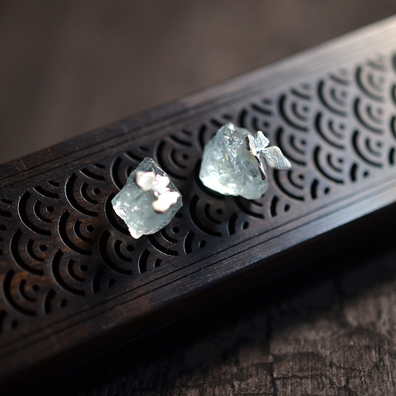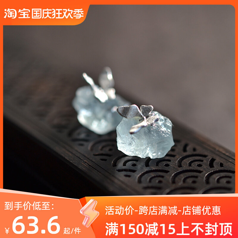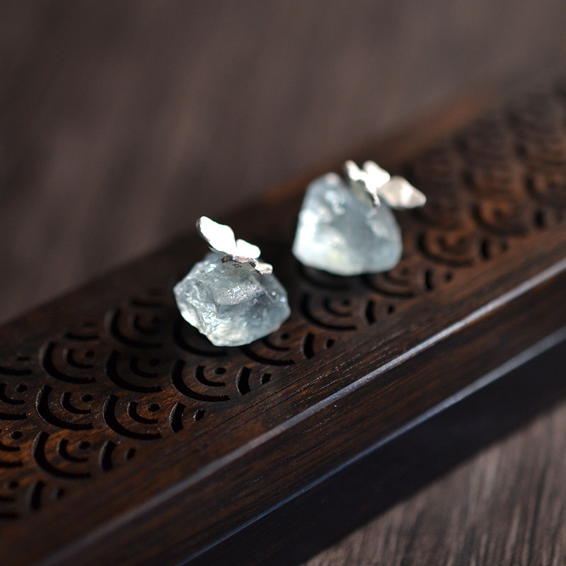 S925银古风古典耳钉蝴蝶图案造型镶嵌海蓝宝原石不规则耳饰配礼盒