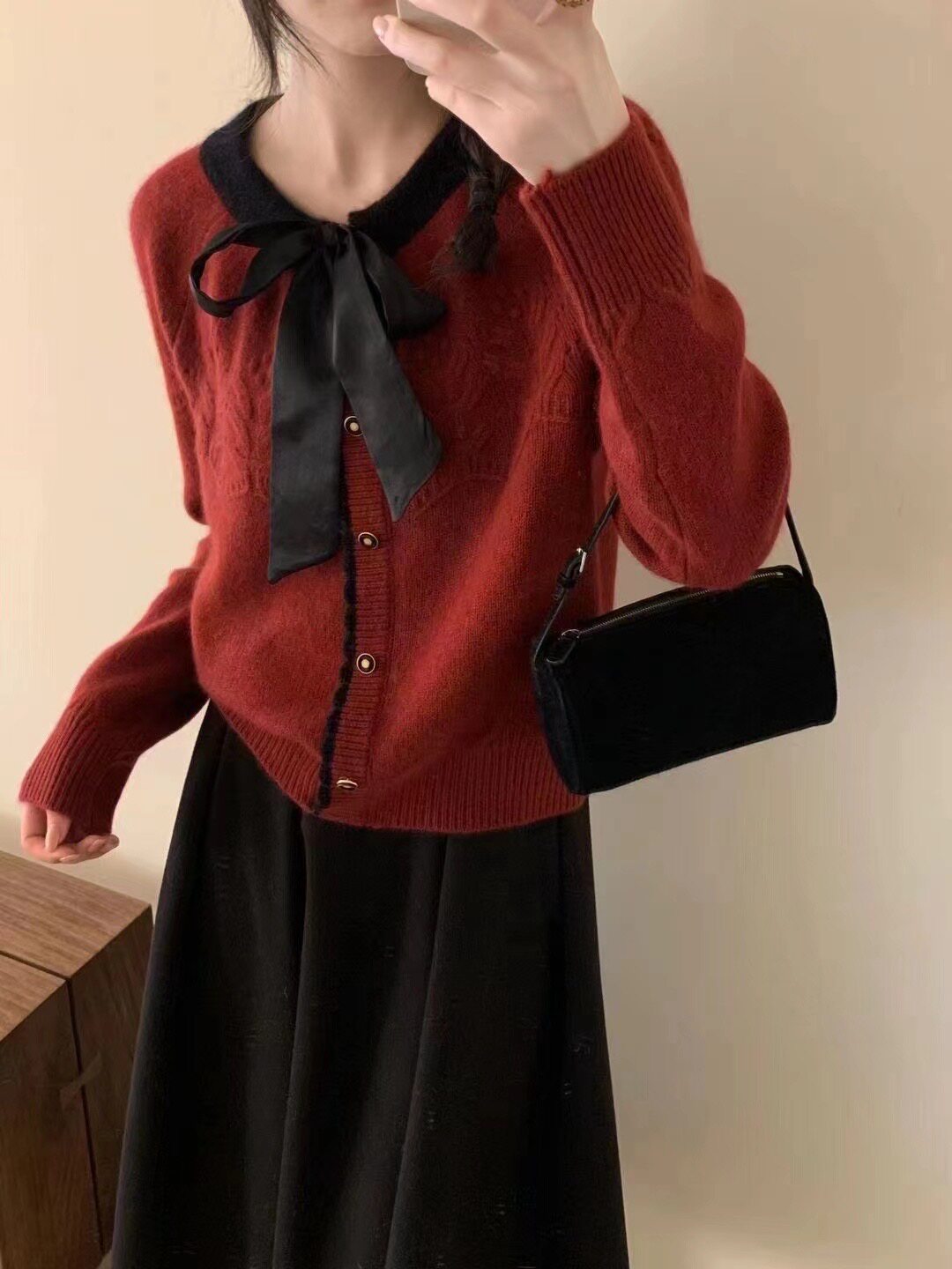 淘宝四季青实体批发女装馆,浣熊绒毛衣女法式系带圆领软糯提花开衫女2023秋冬新款气质打底衫