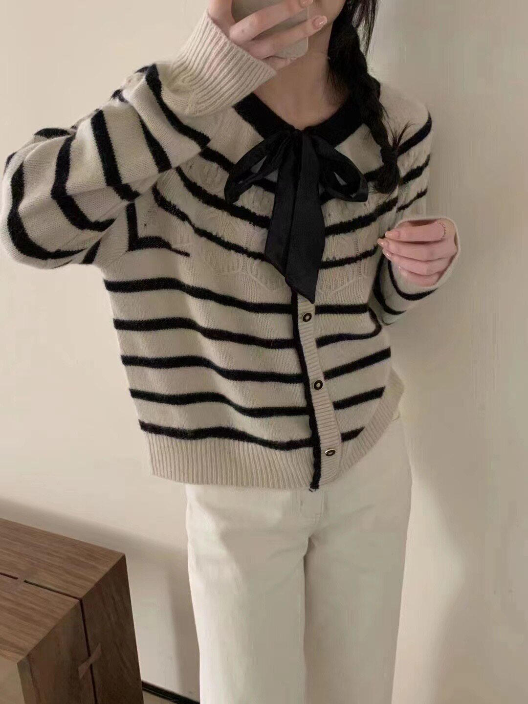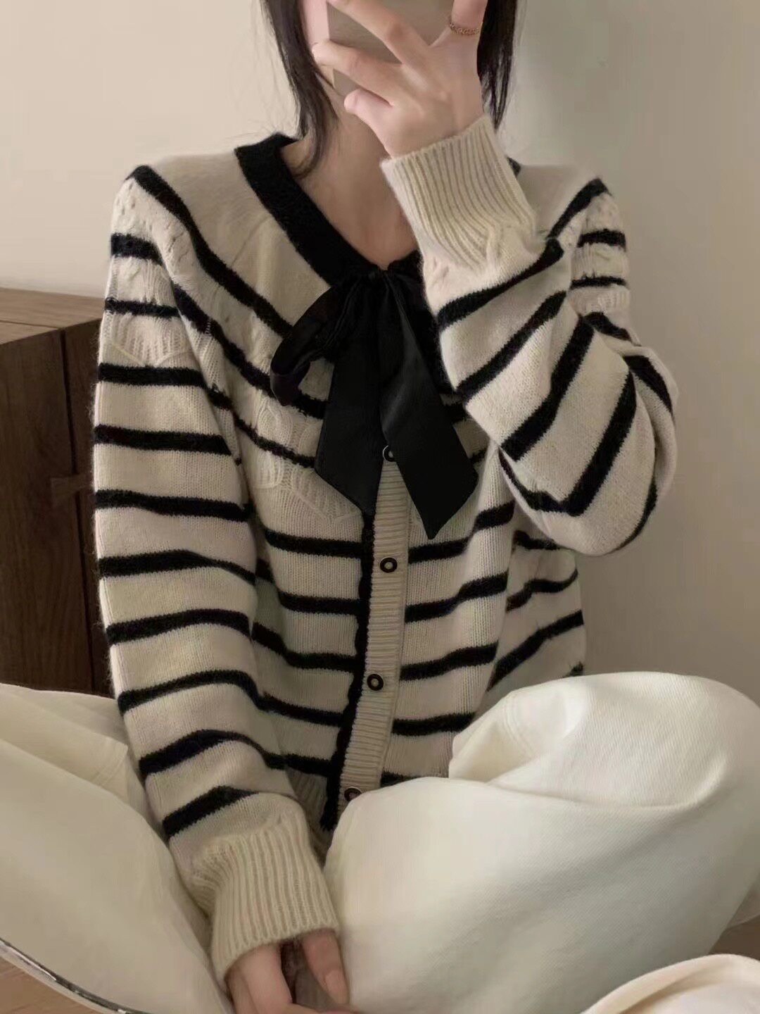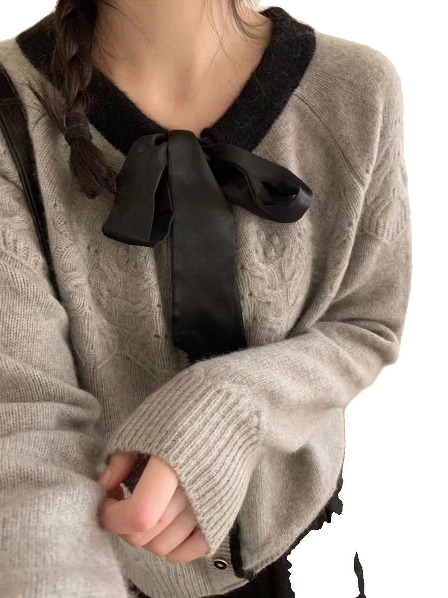 浣熊绒毛衣女法式系带圆领软糯提花开衫女2023秋冬新款气质打底衫