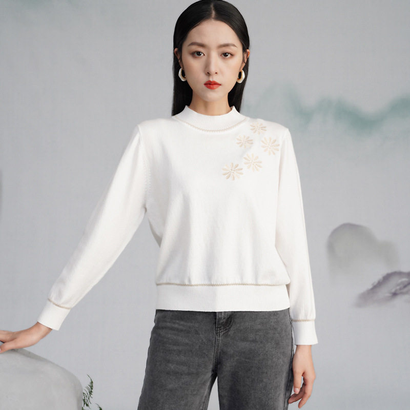 宝迪莱丝2023秋冬莱赛尔天丝针织衫女半高领绣花毛衫长袖打底衫