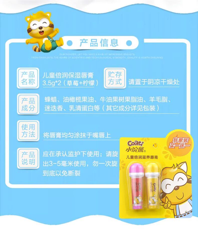 淘宝ST卡美小店,小浣熊儿童润唇膏保湿补水宝宝滋润婴幼儿护唇膏草莓柠檬味2支装