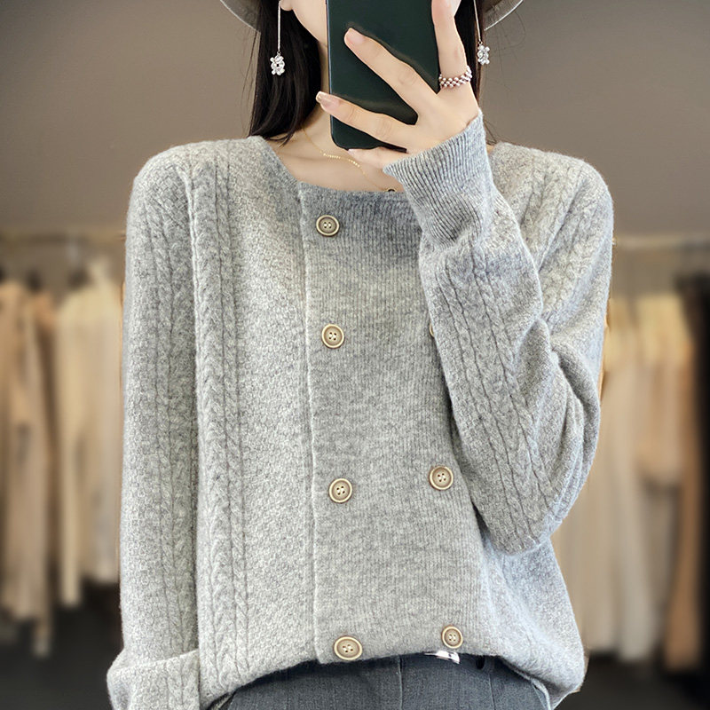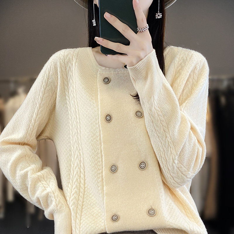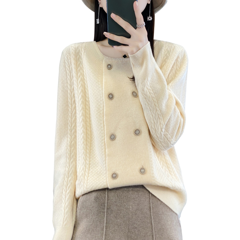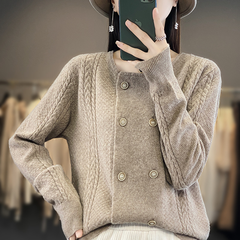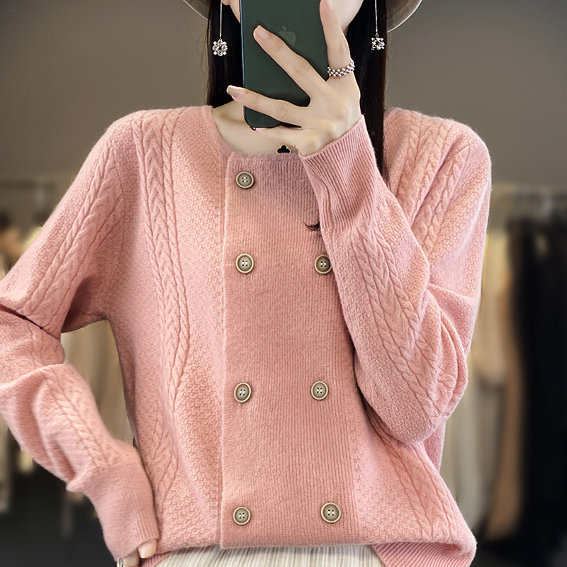 秋冬圆领100%羊绒衫开衫女长袖双排扣毛衣外套宽松羊毛衫针织上衣