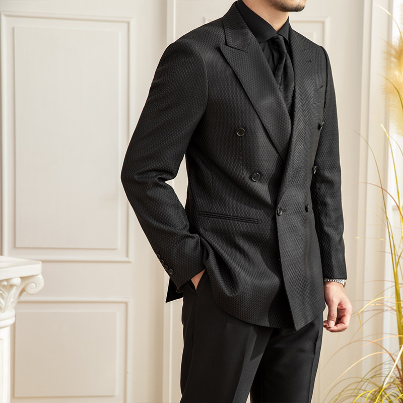 鹿三先生帅气宴会晚会肌理格纹黑色西服通勤休闲六扣一西装外套男