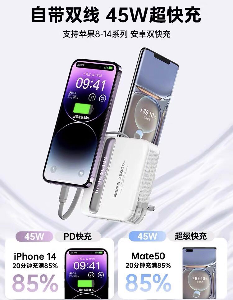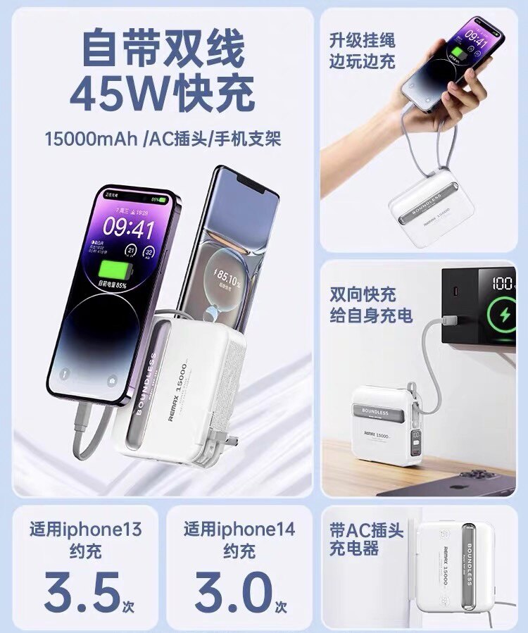 remax睿量充电宝自带线三合一插头小巧便携适用苹果快充移动电源