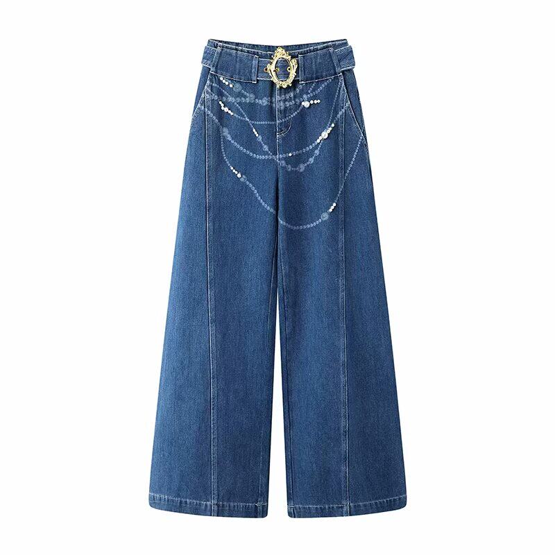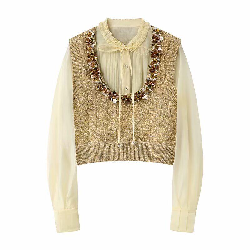 淘宝shero外贸女装,吴宣仪同款春珠片花朵拼接针织假两件衬衫复古浮雕腰带阔腿牛仔裤