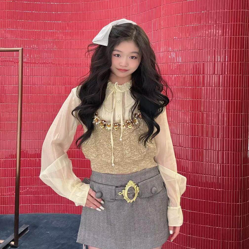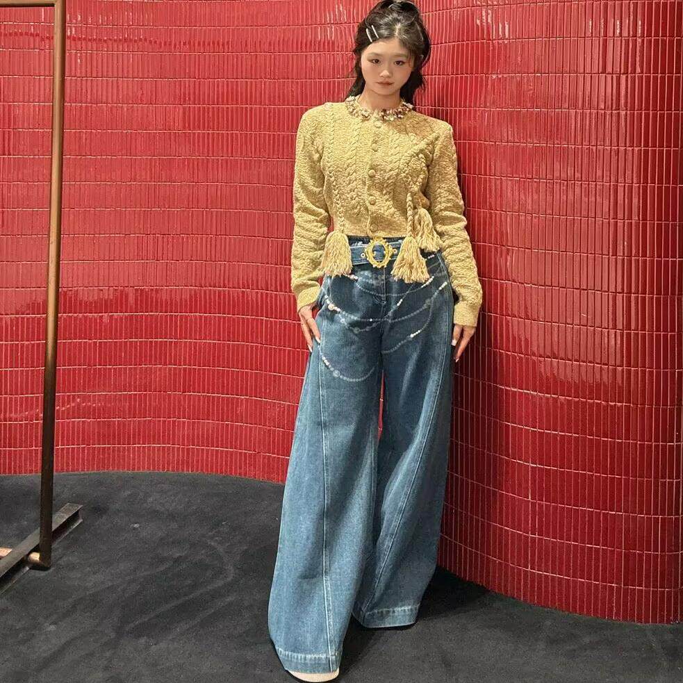 吴宣仪同款春珠片花朵拼接针织假两件衬衫复古浮雕腰带阔腿牛仔裤