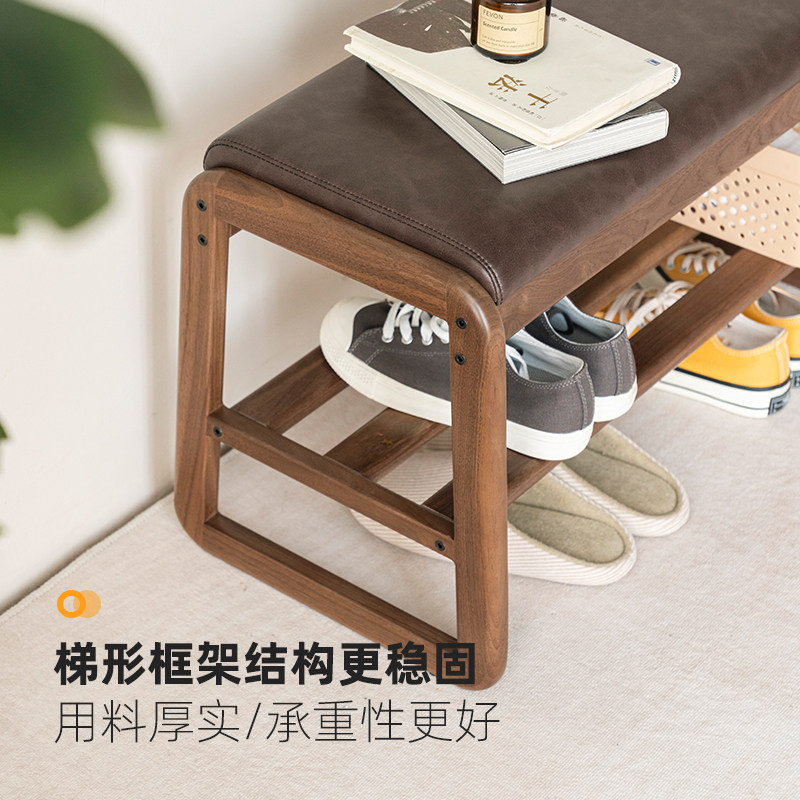 实木换鞋凳家用鞋柜一体门口穿鞋凳黑胡桃木进门坐凳带鞋架收纳凳