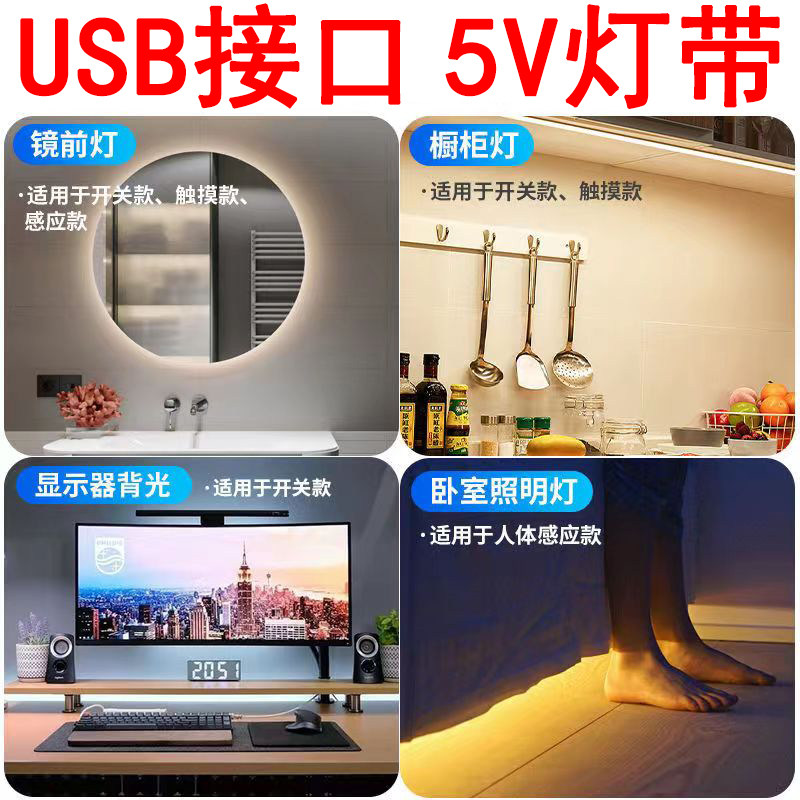 淘宝贝加尔照明,5v led灯带usb接口自粘cob电池款感应免走线有线悬空电视展柜专用