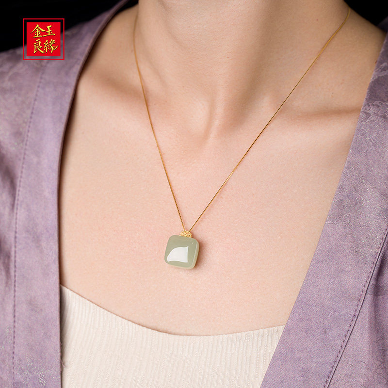 金玉良缘【小方糖】无事牌18k金吊坠天然和田玉吊坠项链新款