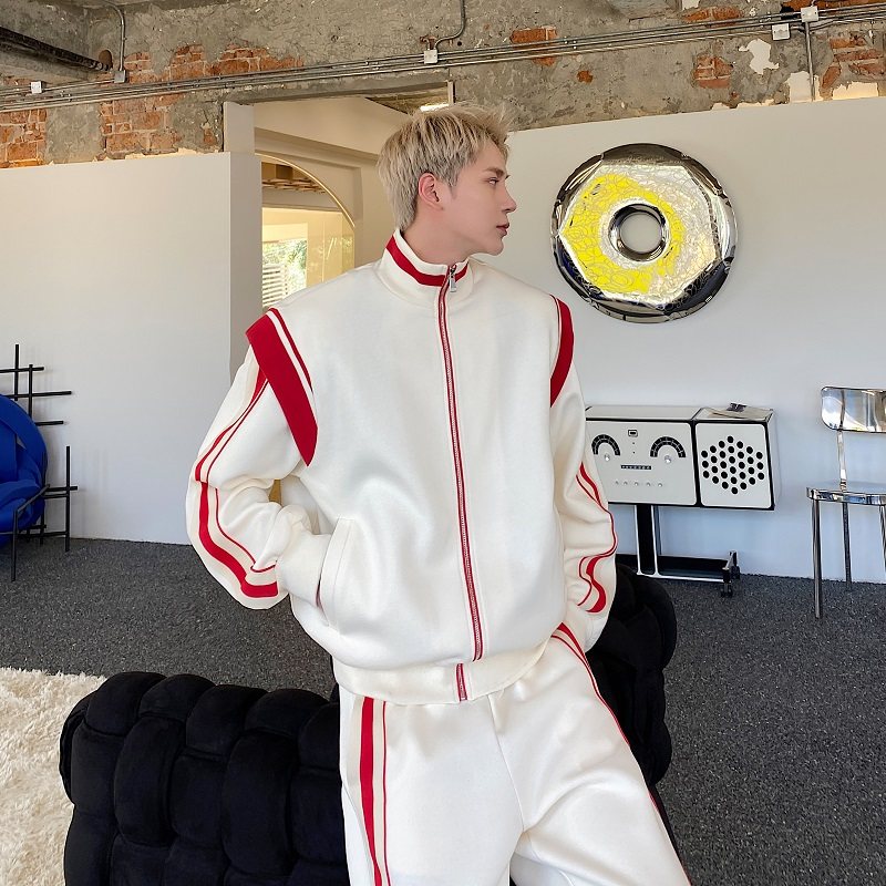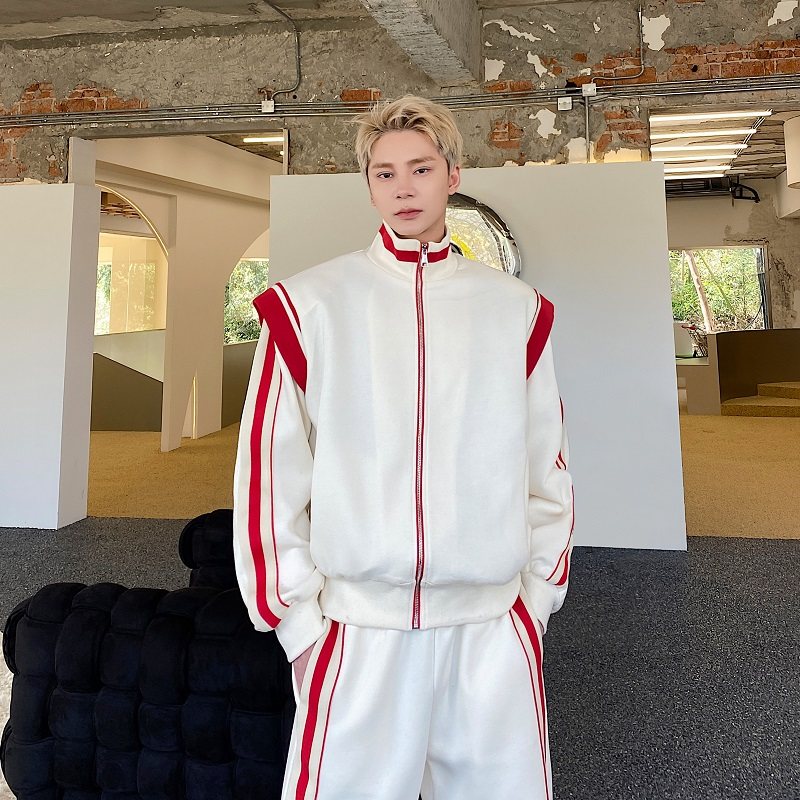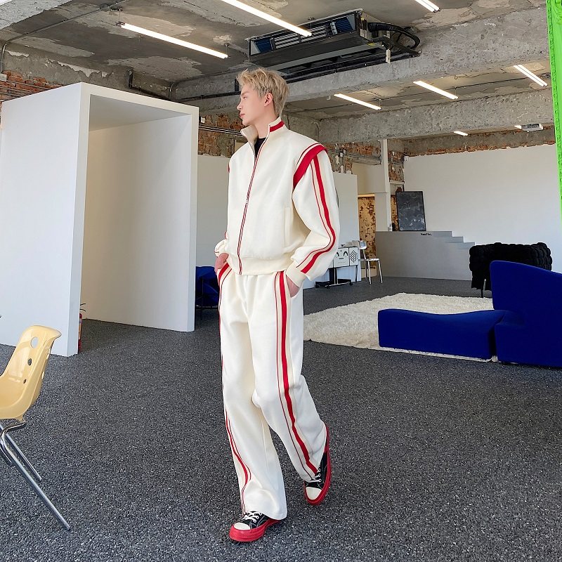 淘宝我爱文艺美型男,撞色开衫立领卫衣长裤男套装韩版宽松时尚炸街休闲运动两件套潮流