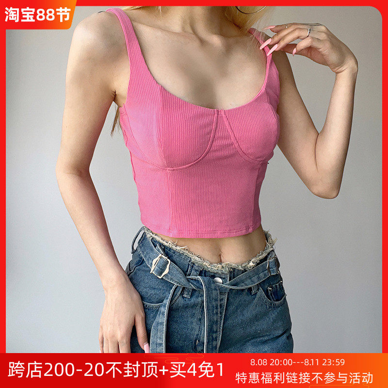 美式复古街头辣妹风粉色条纹针织背心胸型吊带夏季修身显瘦短上衣