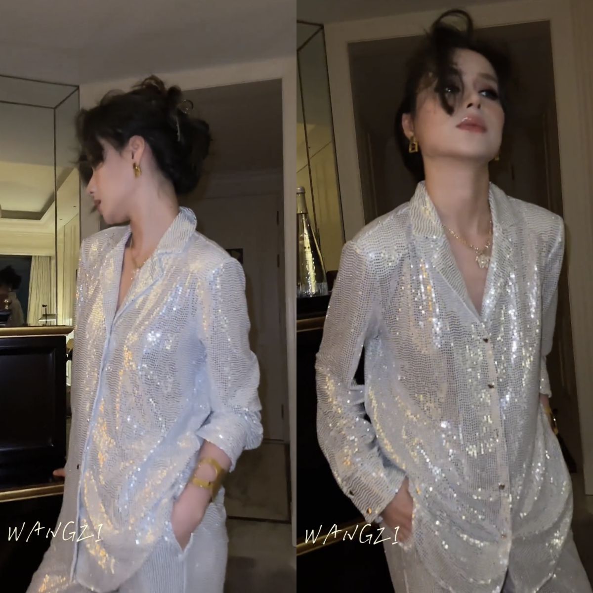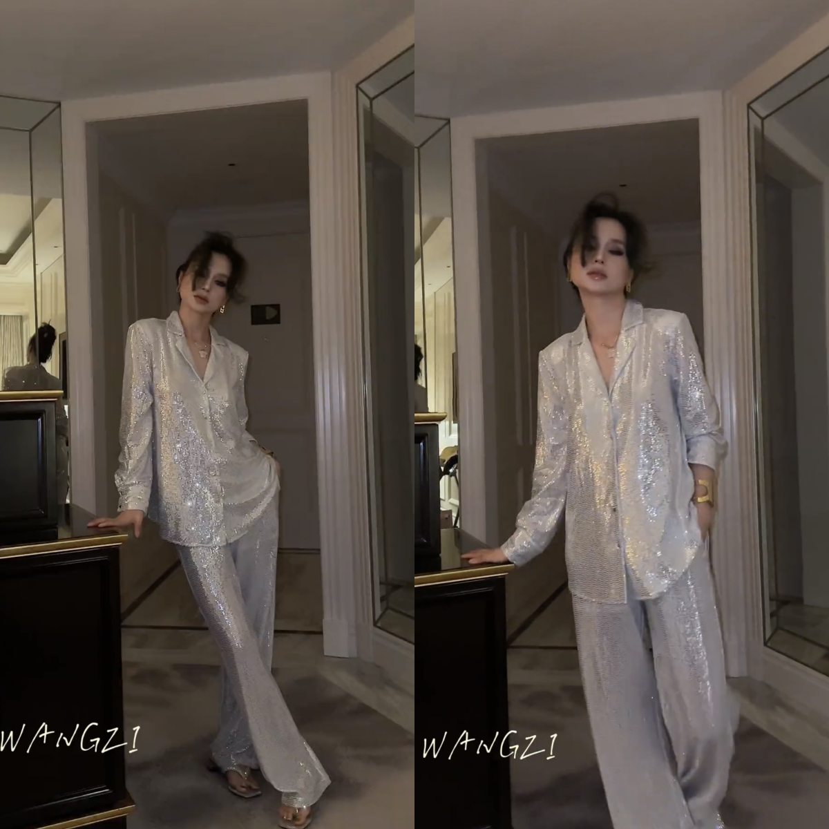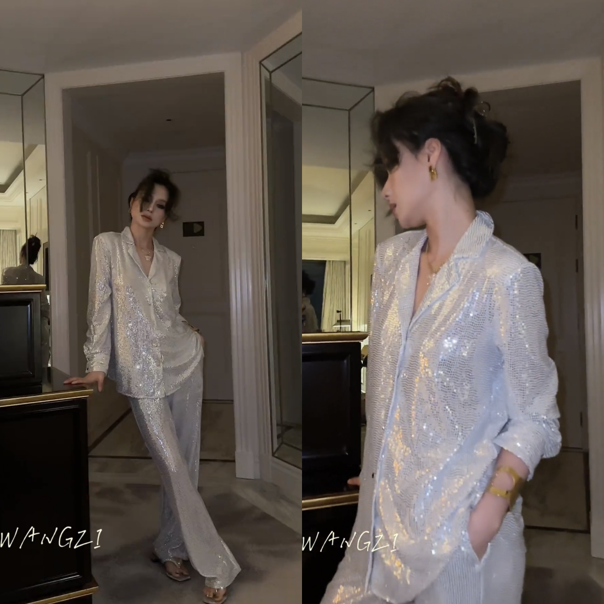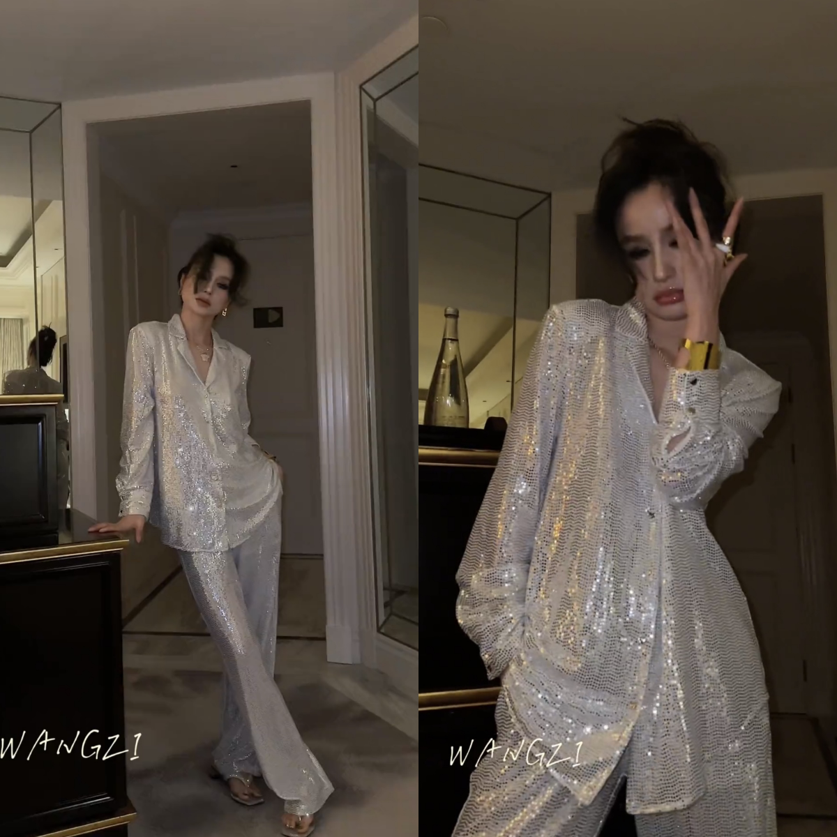 淘宝芒果自制 大女装店,2023秋季新款韩版性感白色高级感亮片西装外套休闲阔腿裤两件套女