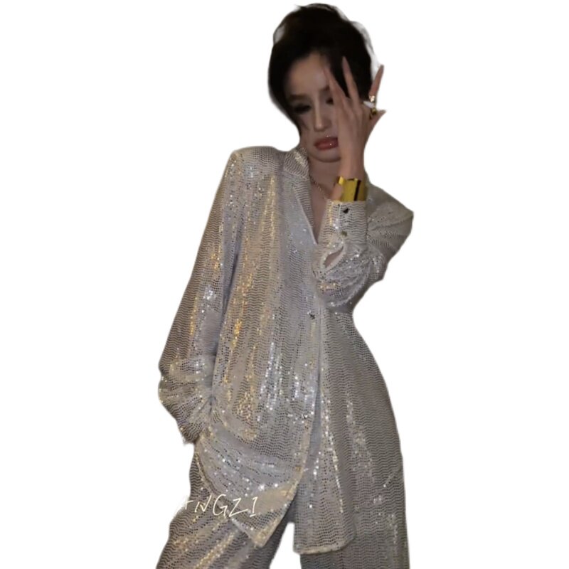 2023秋季新款韩版性感白色高级感亮片西装外套休闲阔腿裤两件套女