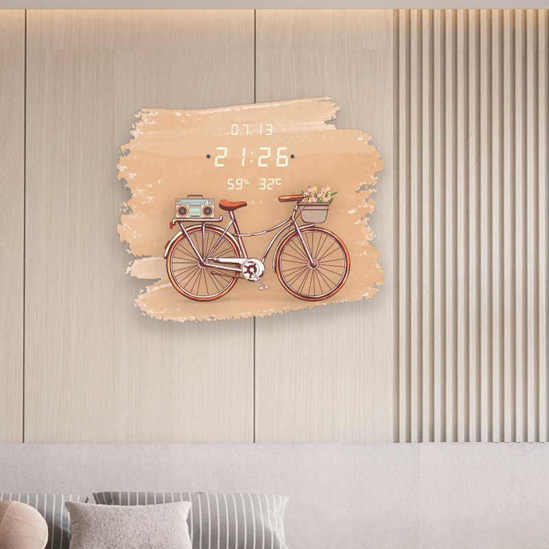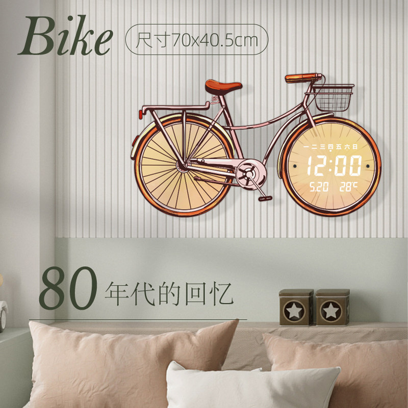 天猫woodshow美最时专卖店,客厅创意自行车静音挂墙数字挂钟,超长续航,静音走时,断电记忆,声控唤醒