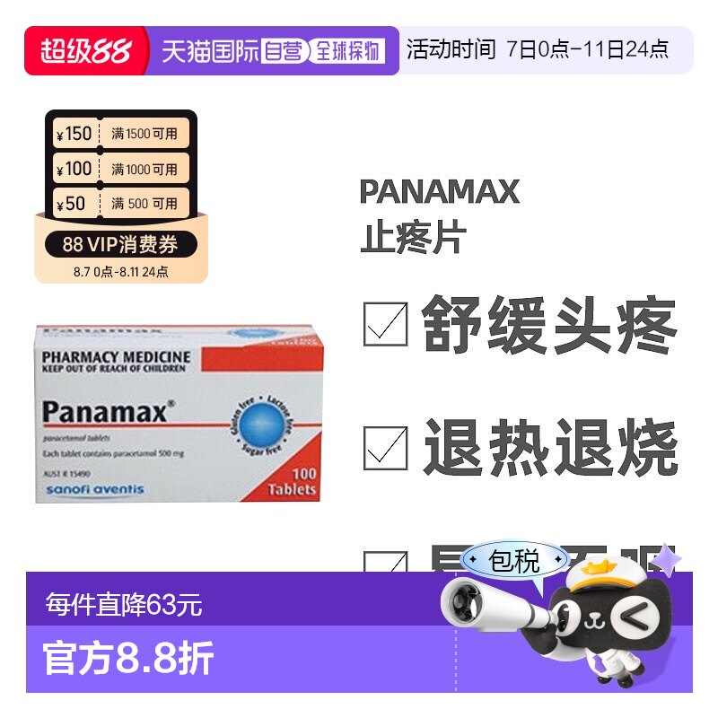 天猫国际全球探物,澳大利亚直邮Panamax止疼片退热退烧快速缓解头疼牙疼不适100片