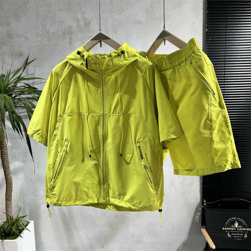 薄款透气连帽短袖套装男夏季潮流纯色百搭短裤情侣宽松休闲两件套