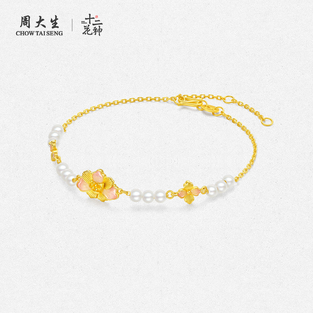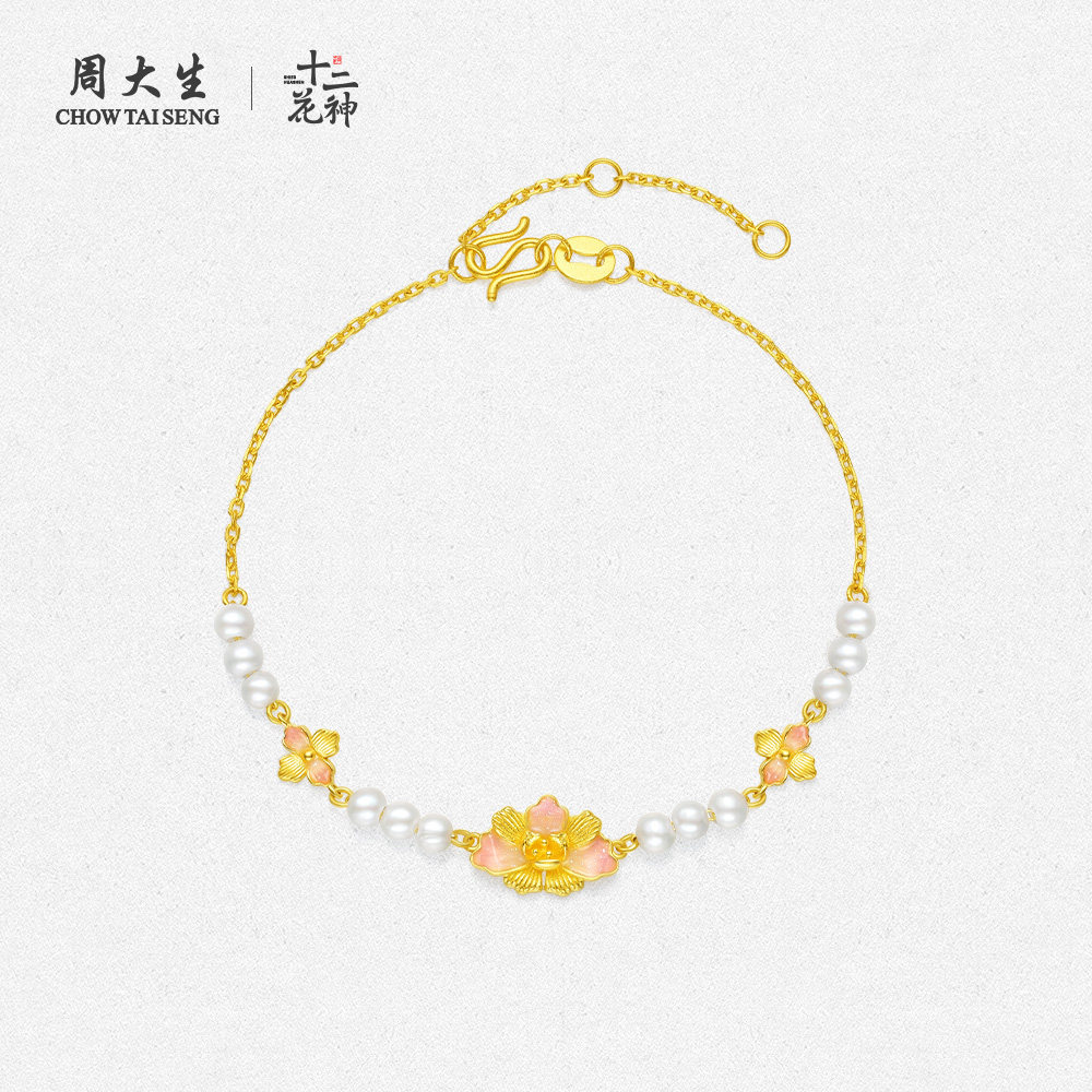 周大生黄金手链足金牡丹花珍珠手串十二花神礼物生日礼物送女友