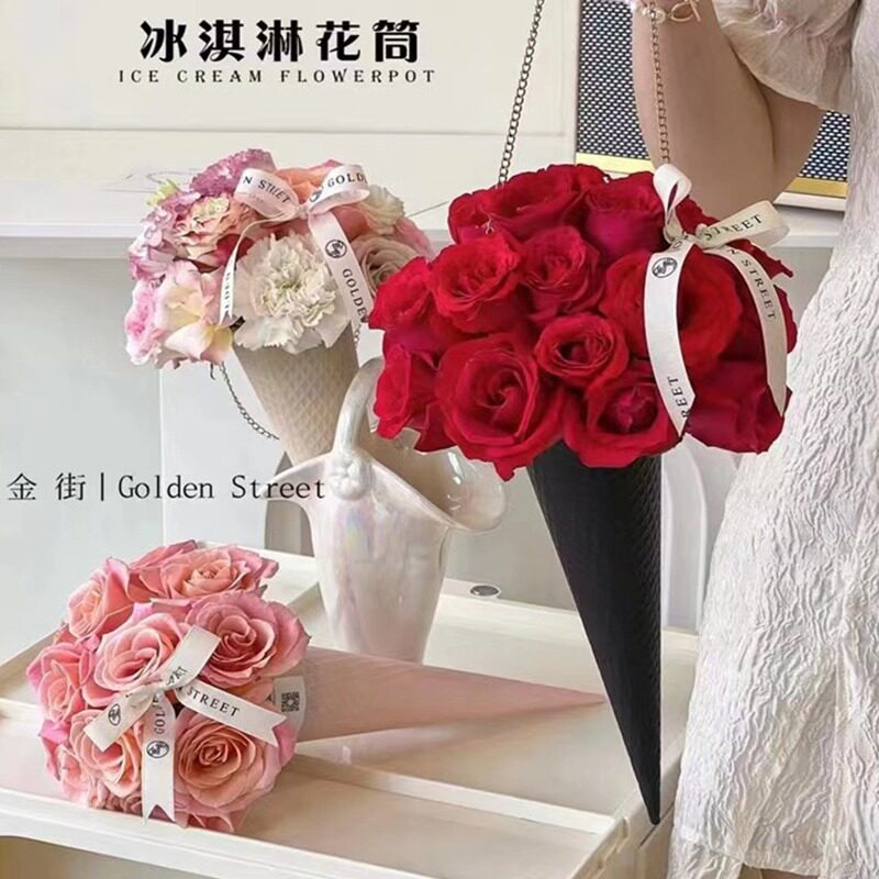 冰淇淋花筒手工diy花束材料包玫瑰花塑料手提盒金属链条抱抱桶