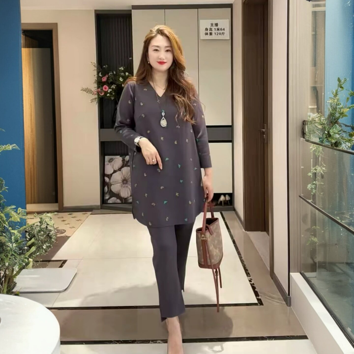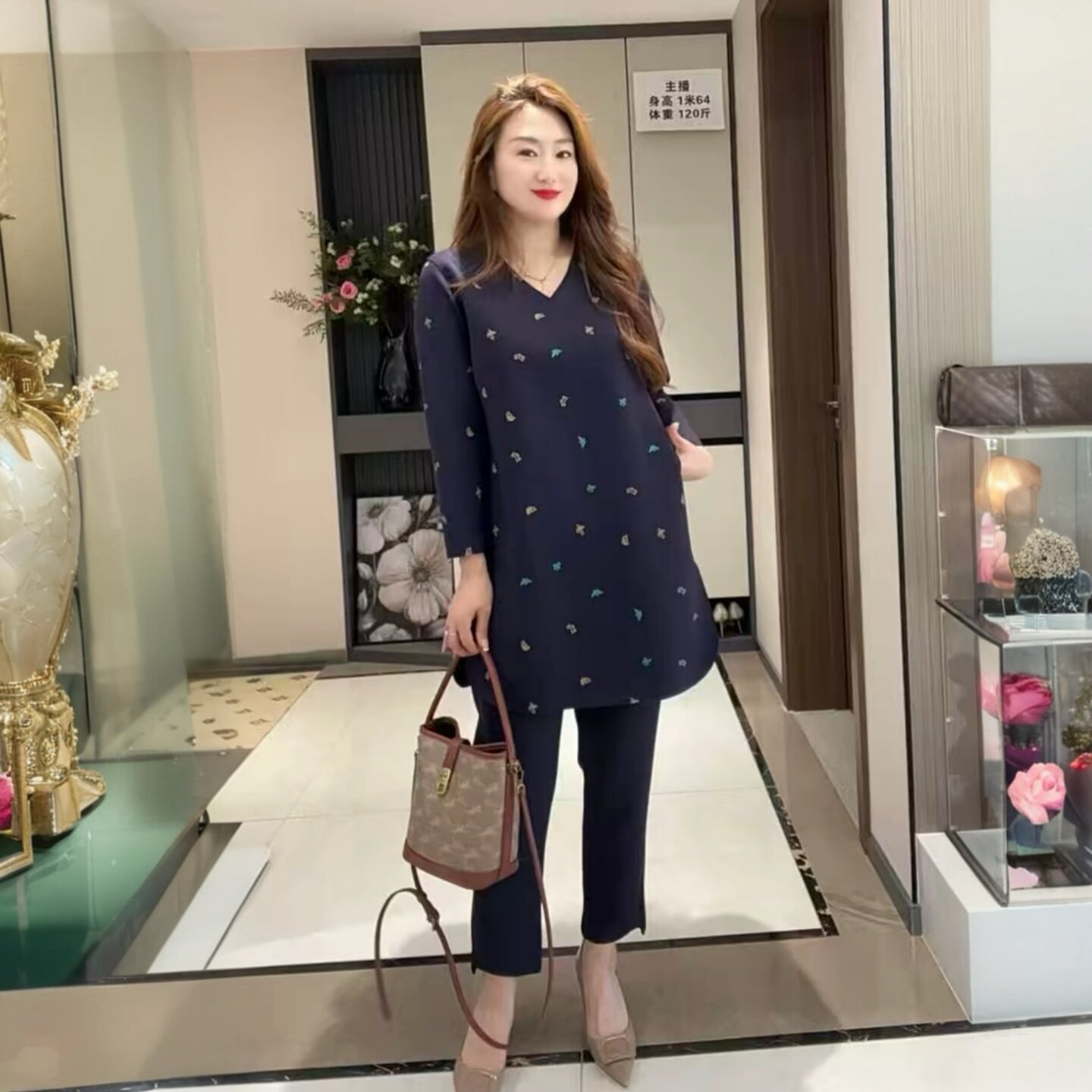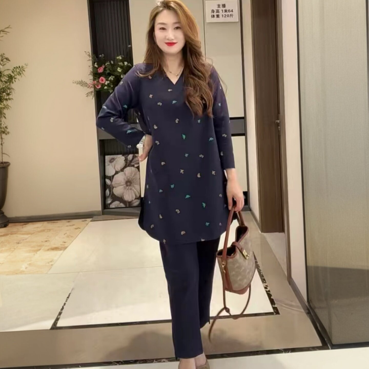 淘宝紫云裳服饰店,时尚洋气高端秋装妈妈宽松遮肚子中长款大版衫空气棉印花两件套装