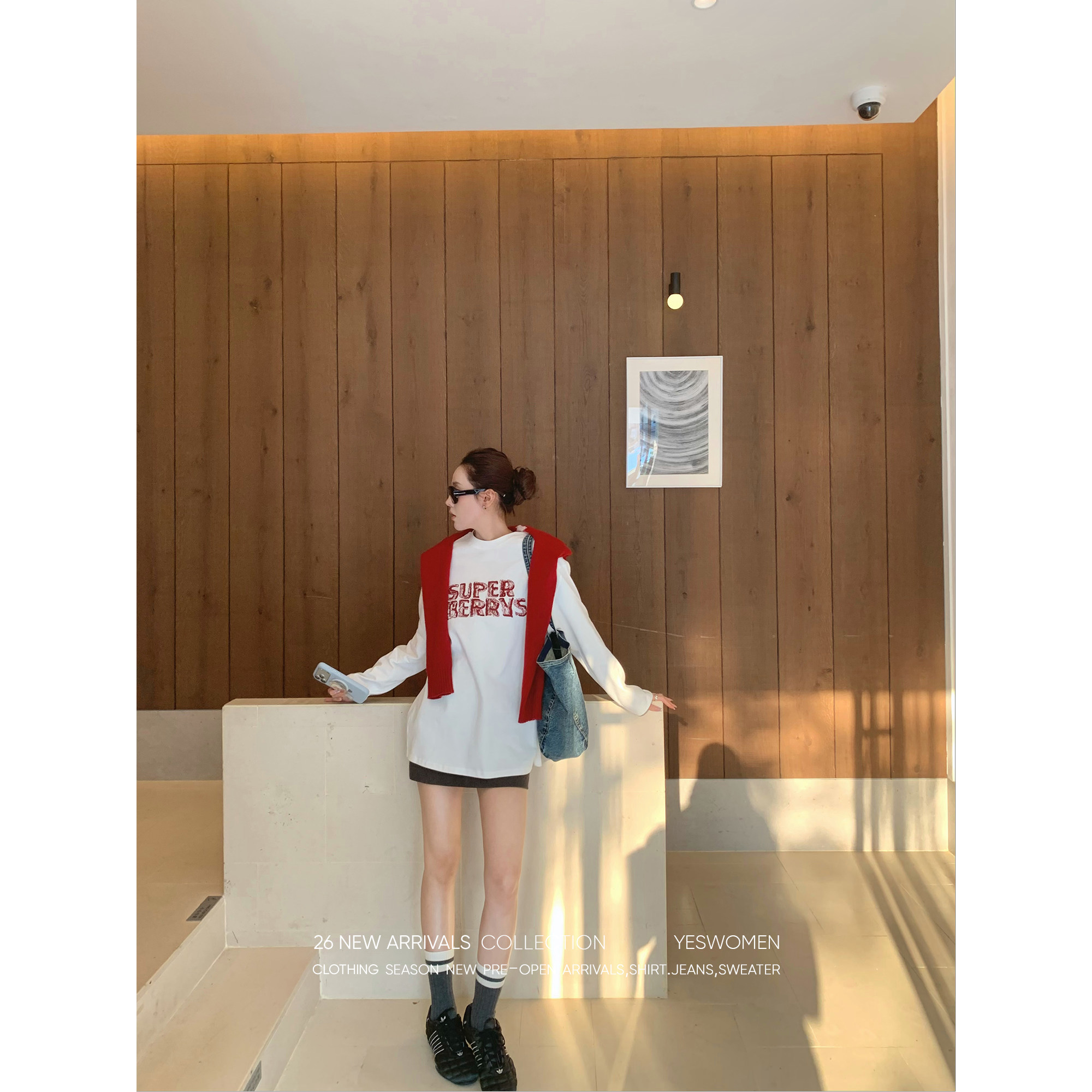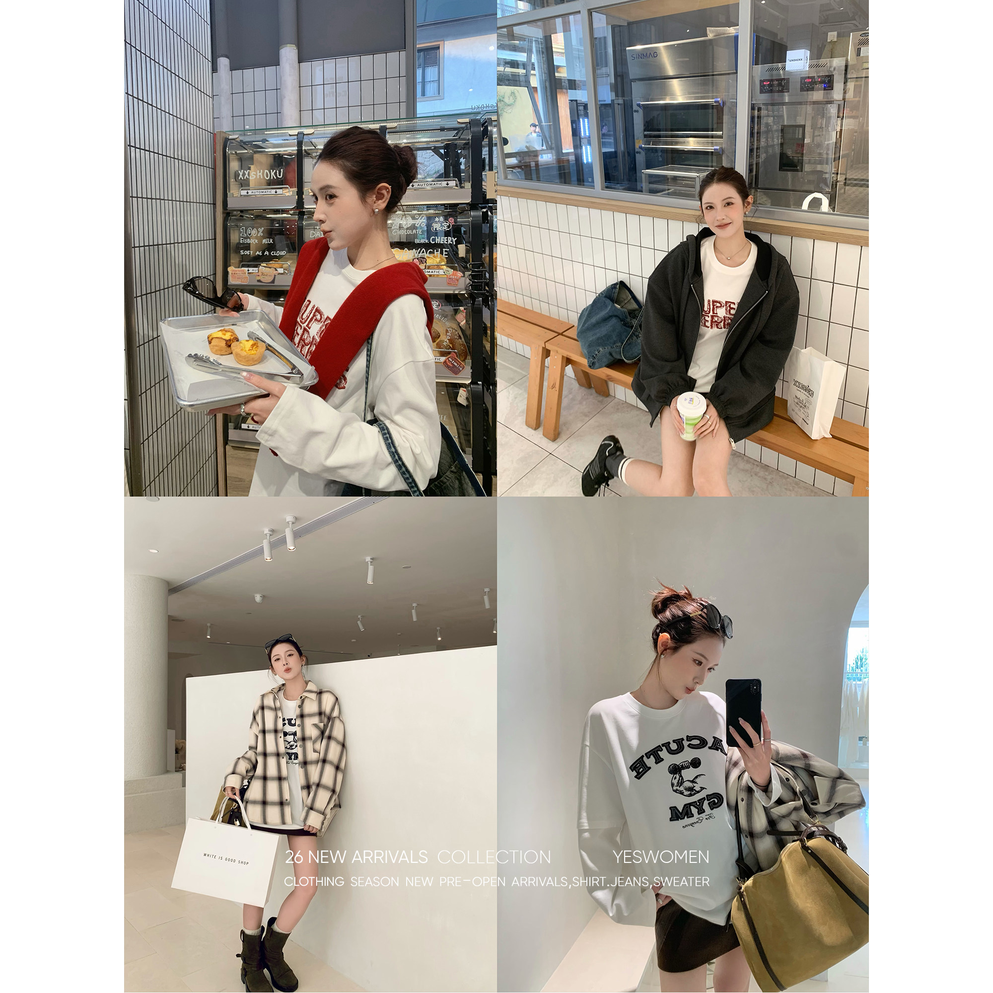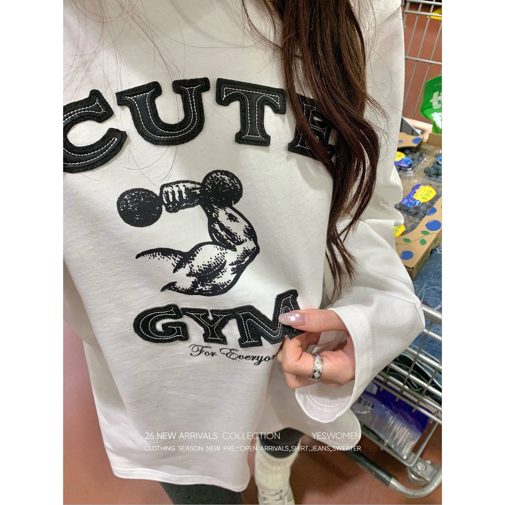 淘宝YESWOMEN 小宜定制,小宜定制 漫感美式T·美式字母刺绣白色T恤 宽松圆领假两件长袖