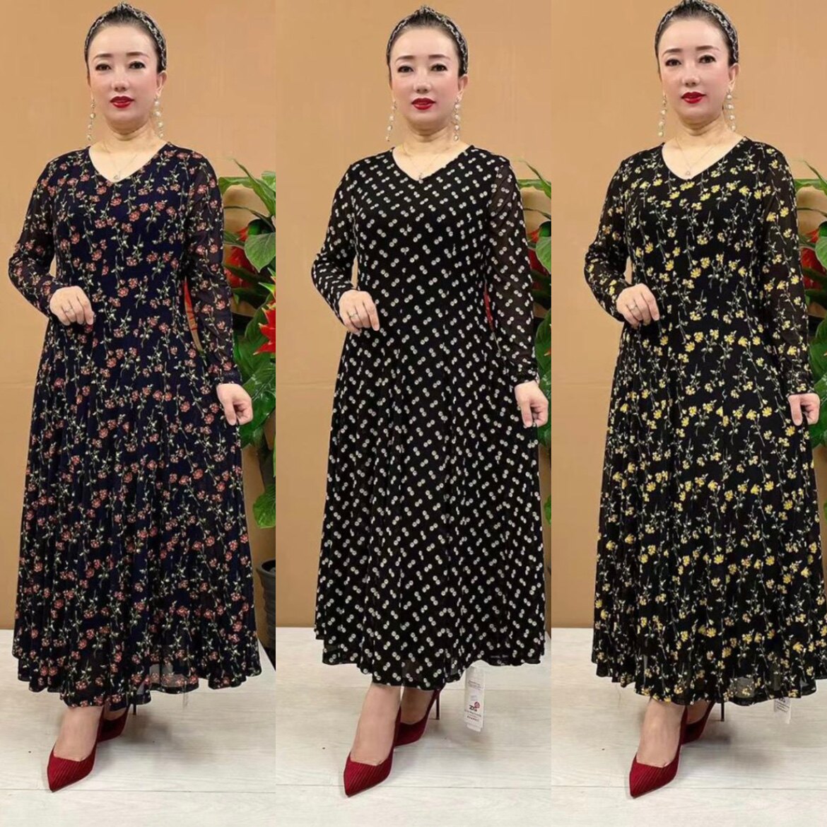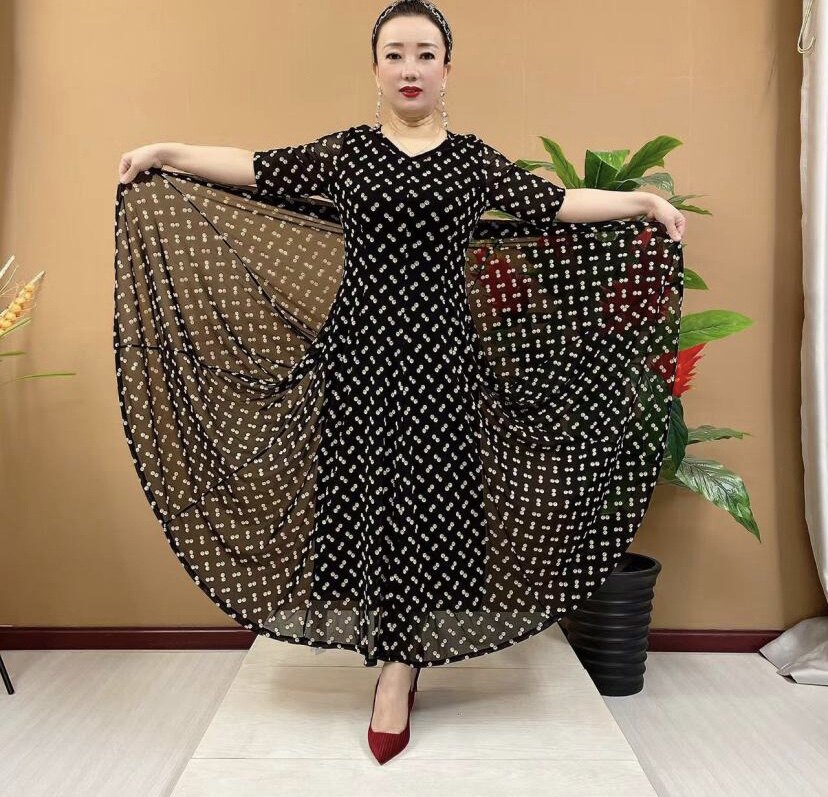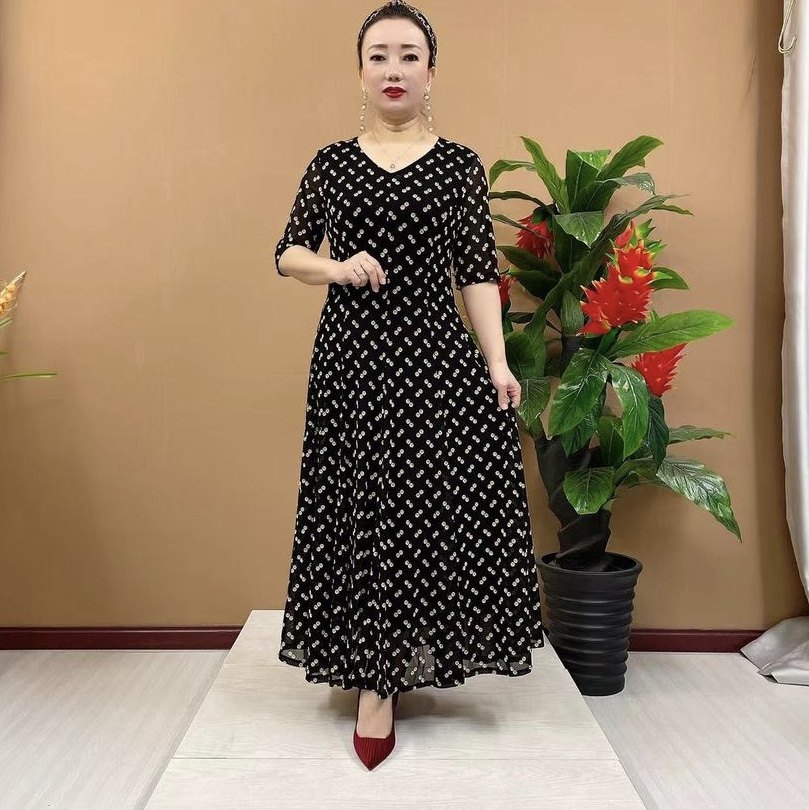 阔太太高弹连衣裙气质大码春夏长袖时尚妈妈装长款台湾纱碎花裙子