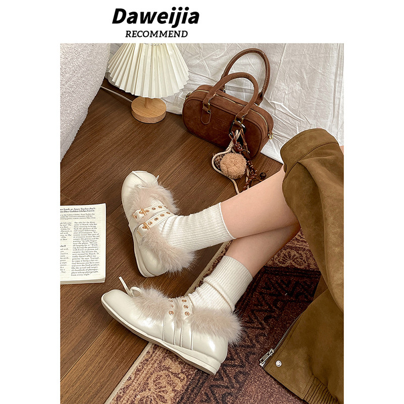 天猫天天特卖食品直营,黑色法式方头厚底玛丽珍毛毛鞋女2025新款冬外穿保暖加绒小皮鞋子
