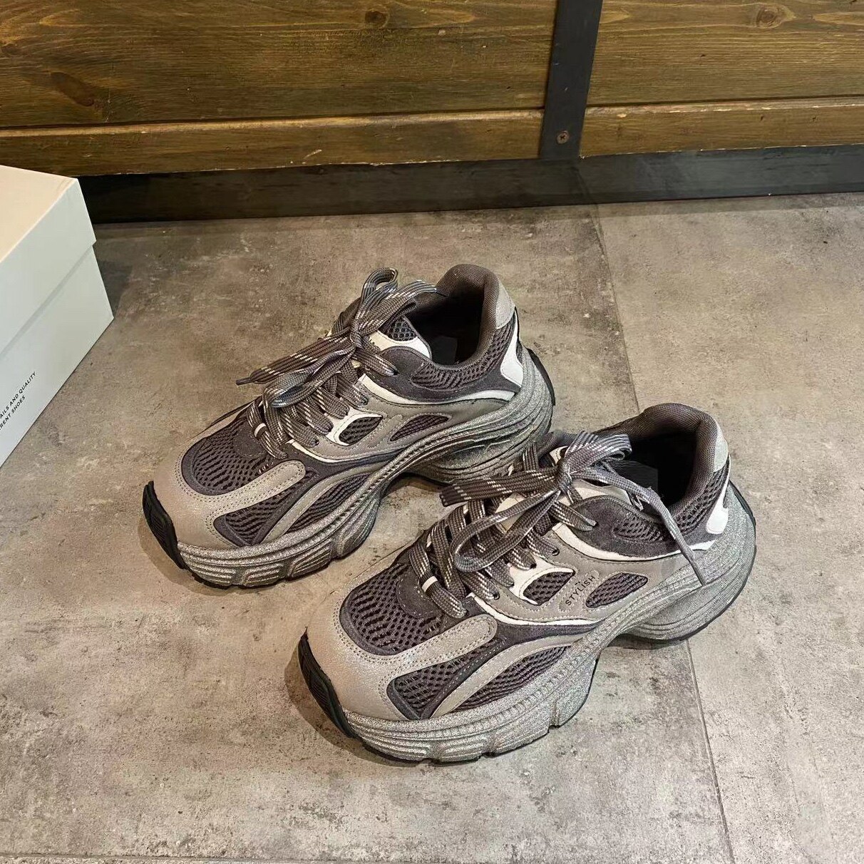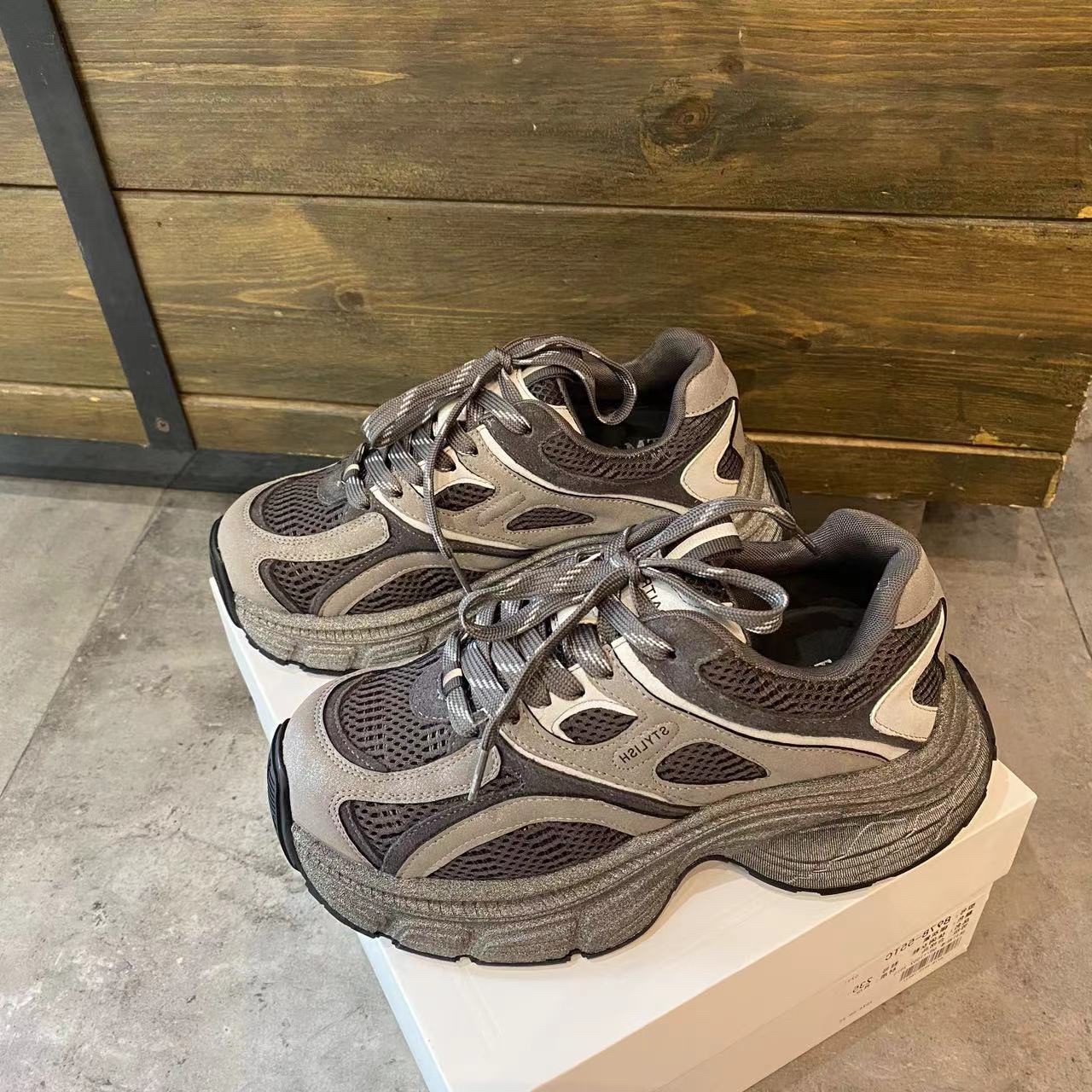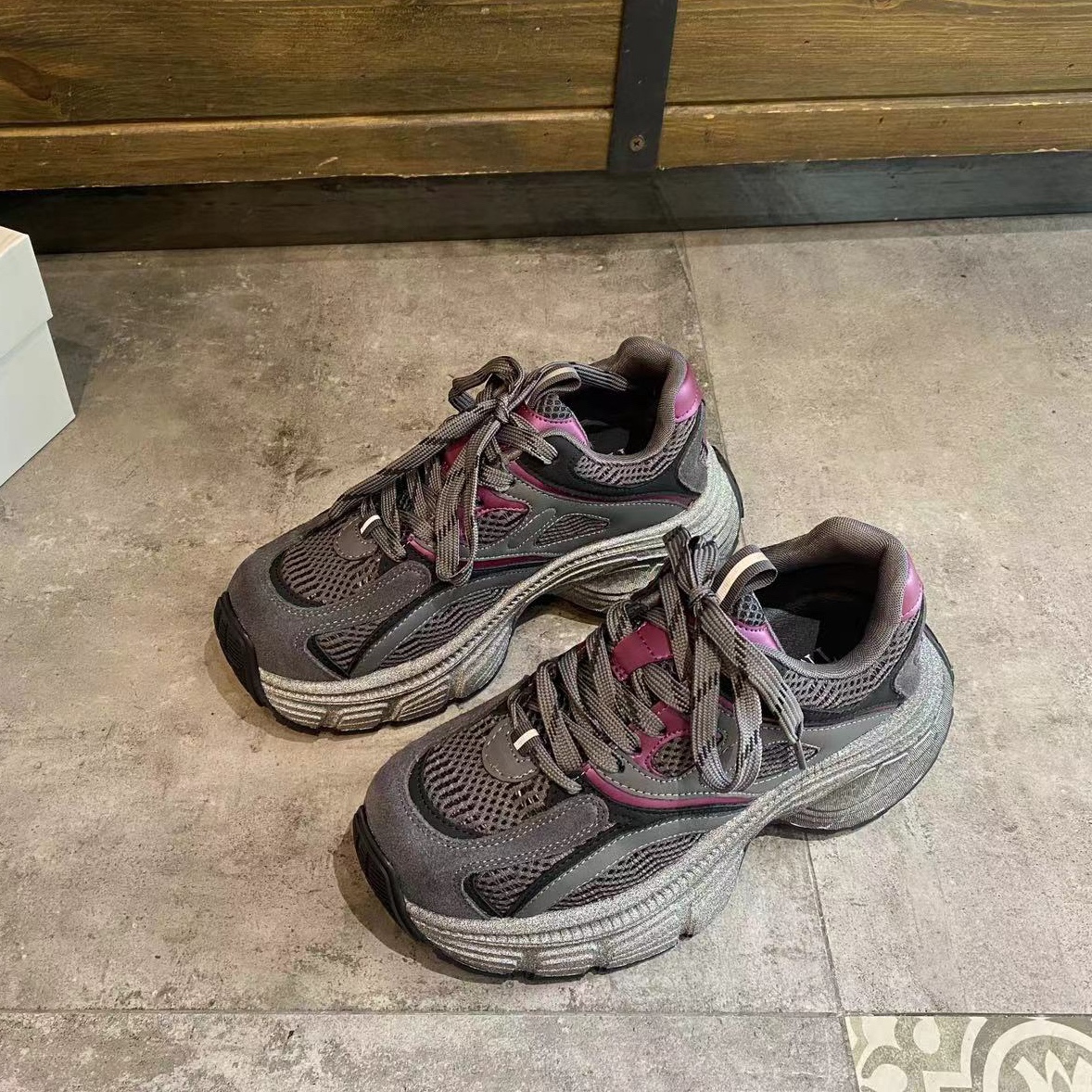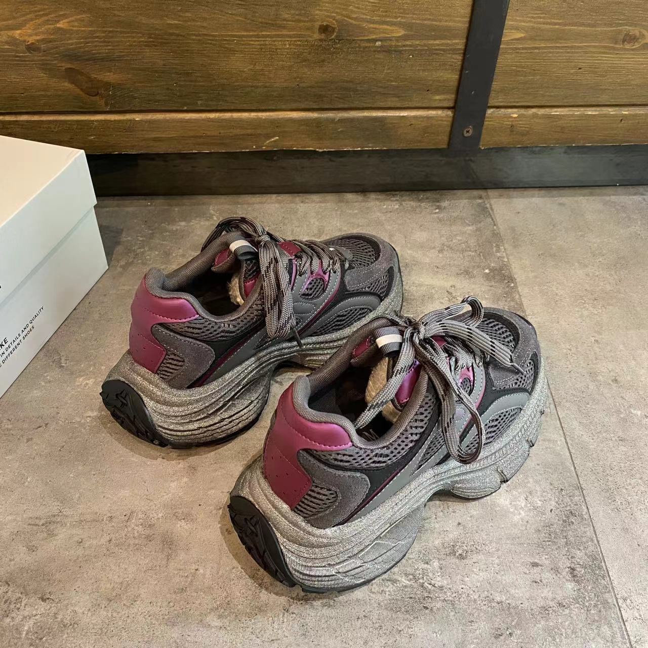 淘宝妖精de部落阁,灰紫色老爹鞋女秋季2024新款厚底炸街烟灰色休闲运动鞋复古脏脏鞋
