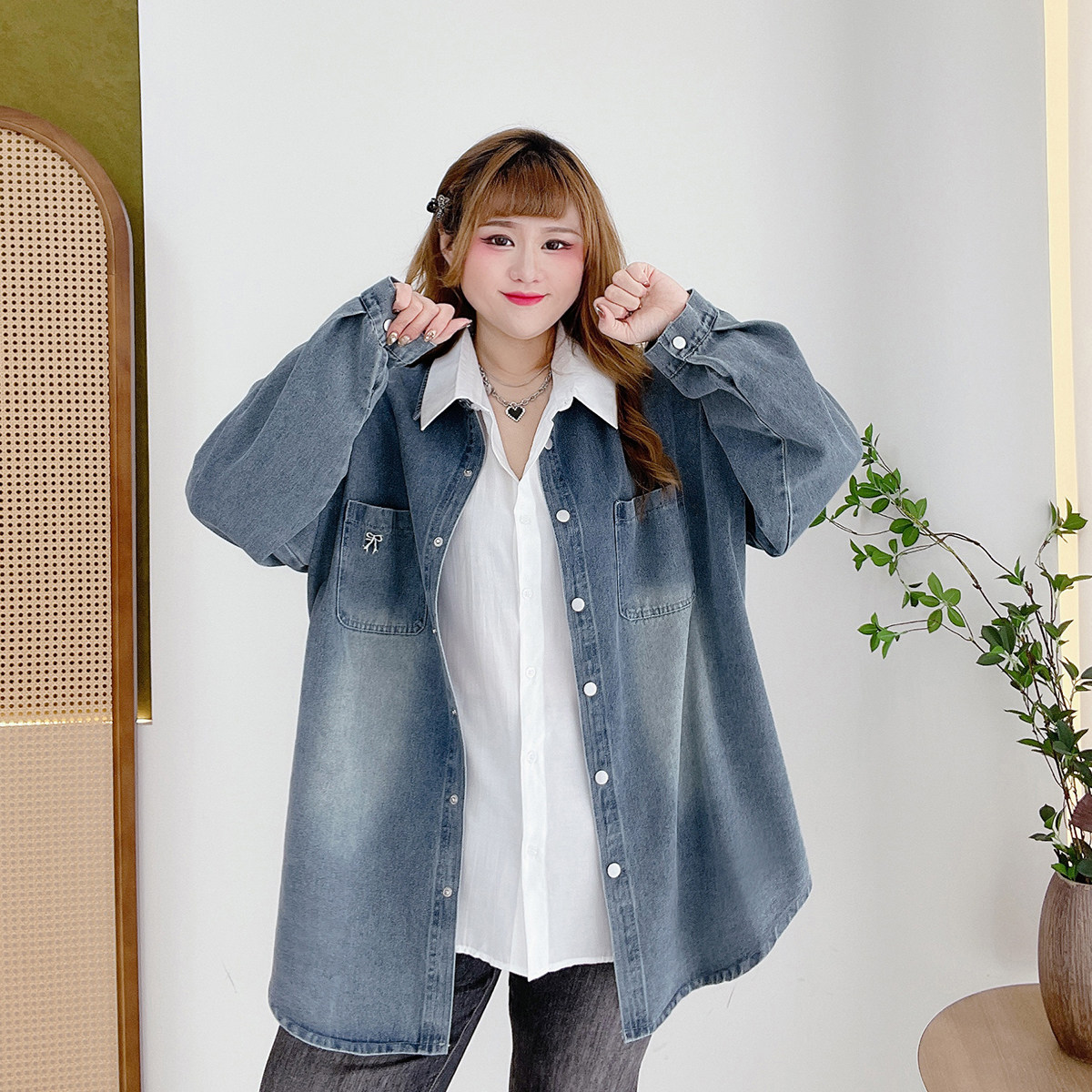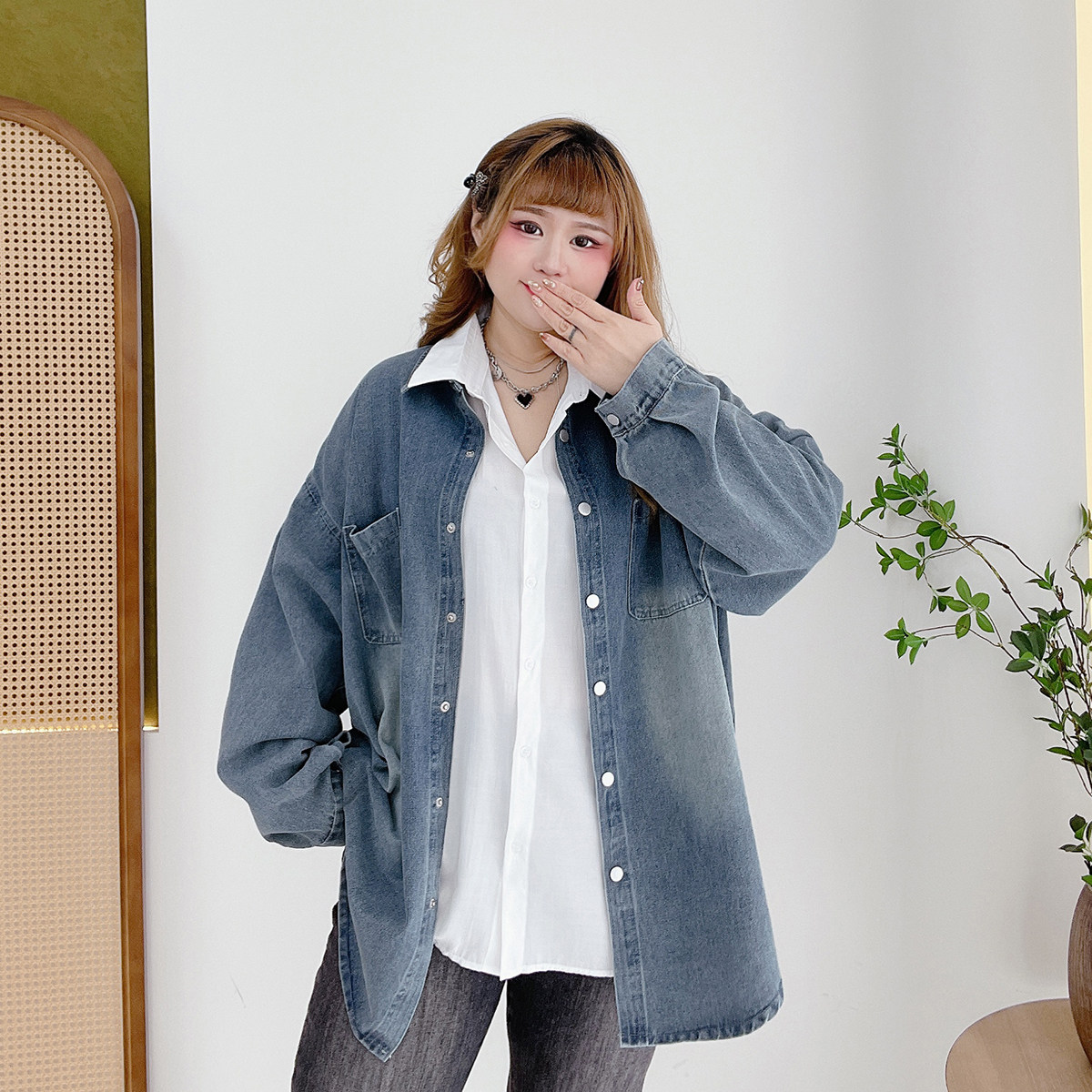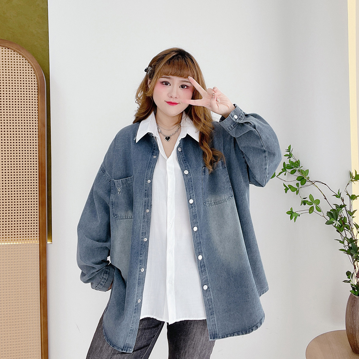 淘宝胖仙女莹莹大码女装,港风复古宽松遮肉百搭牛仔衬衫