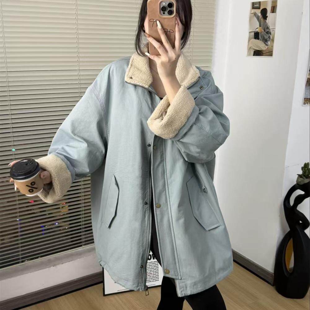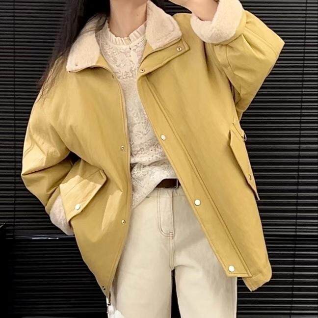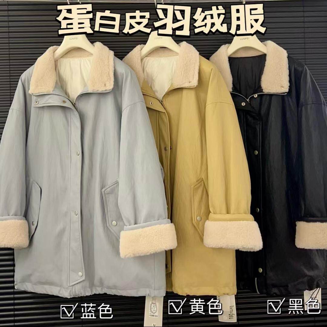淘宝DF女装正品店,欧货高端2024冬季新款立领羊羔毛中长款蛋白皮羽绒服风衣外套女