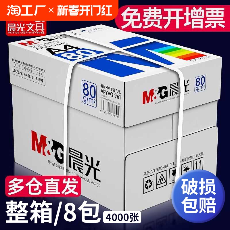 晨光a4纸打印复印纸70g整箱a4纸张打印白色纸80g一箱五包8包4000张实惠装500张草稿纸白纸办公用纸张加厚包邮