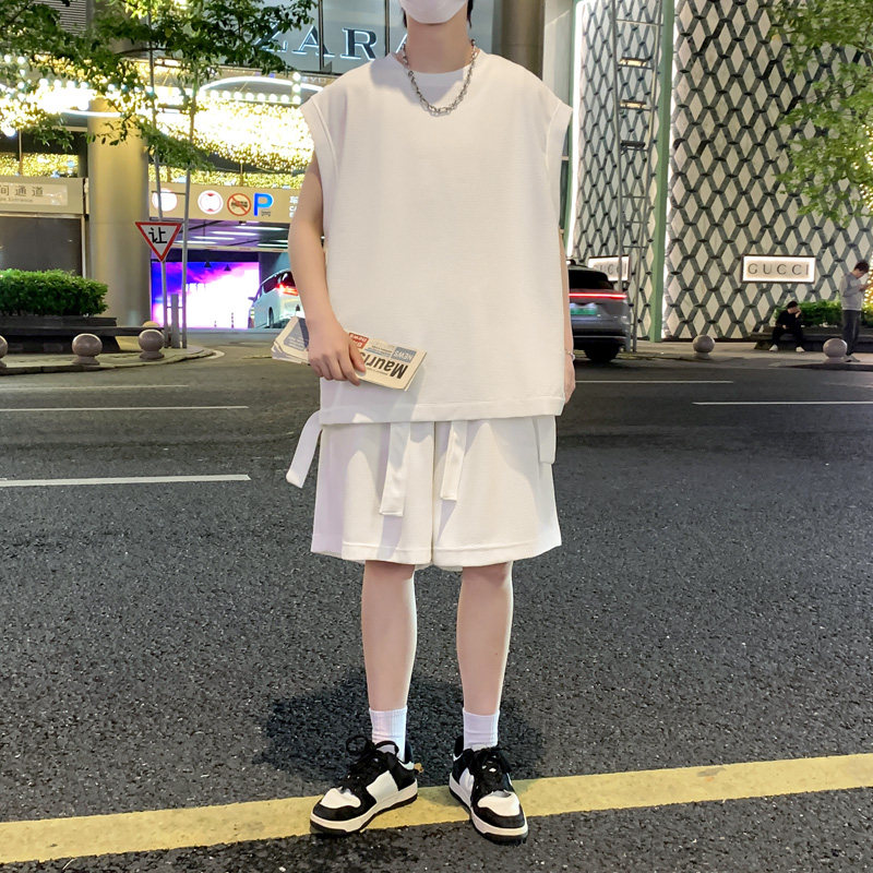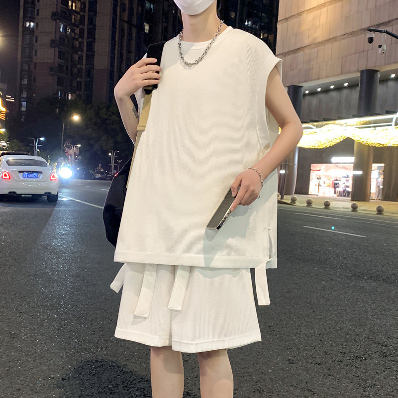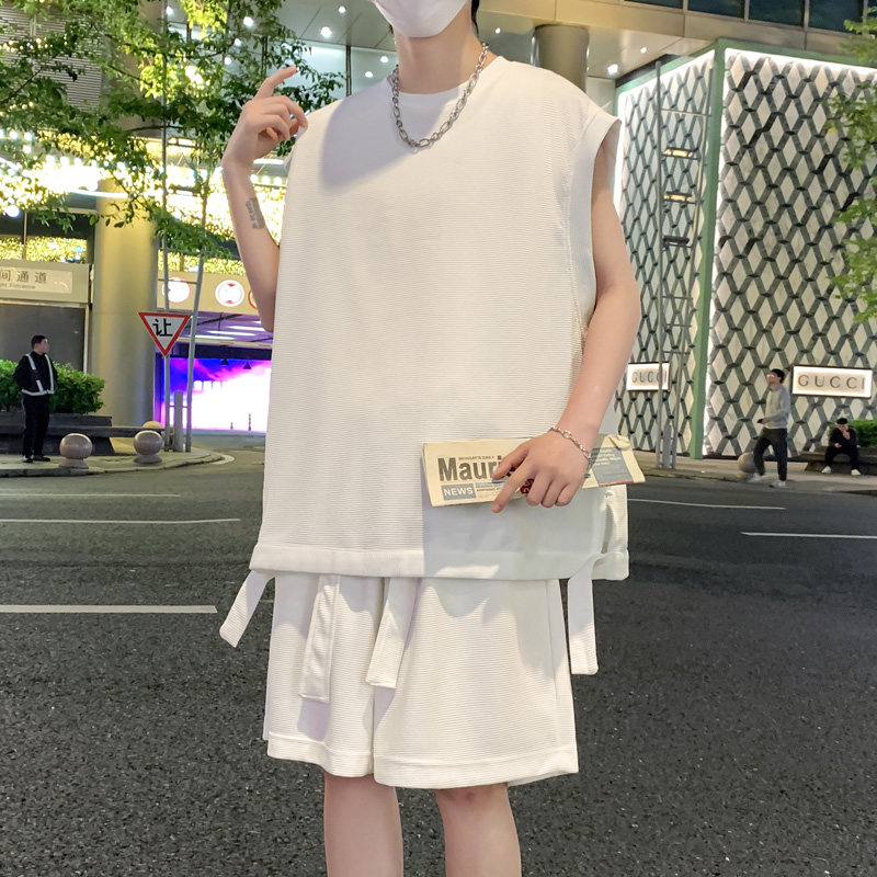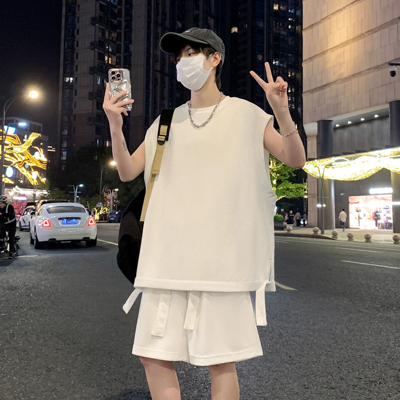 休闲运动套装男夏季冰丝坎肩背心男穿搭一整套无袖t恤高级感衣服