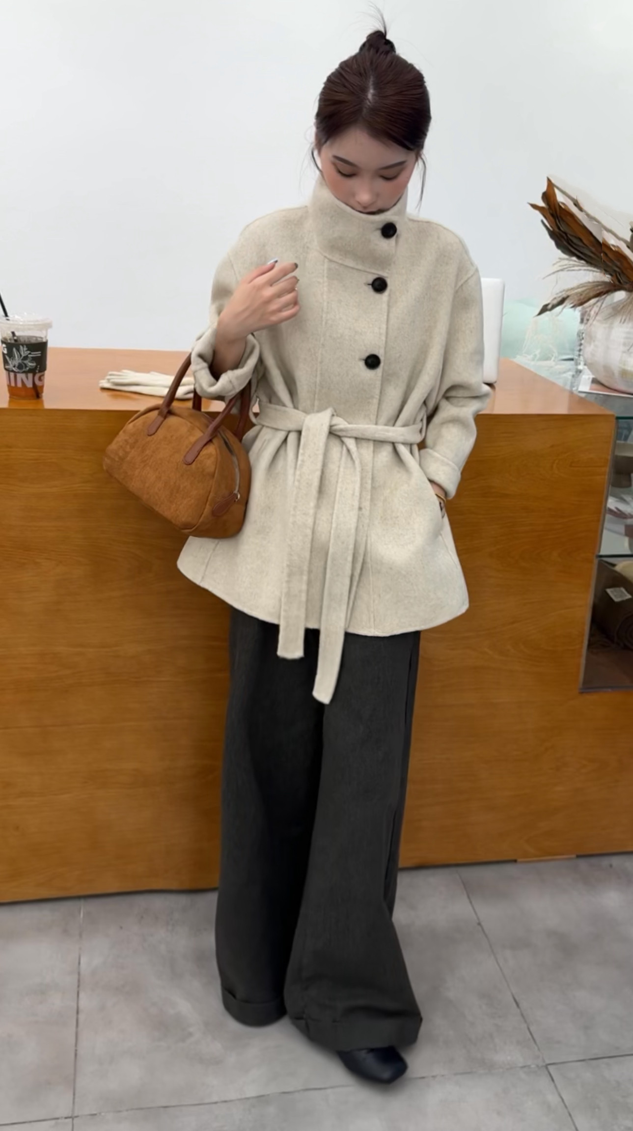 淘宝AaJiE,高端双面羊毛大衣女2024年冬季短款小个子气质立领加厚羊毛呢外套
