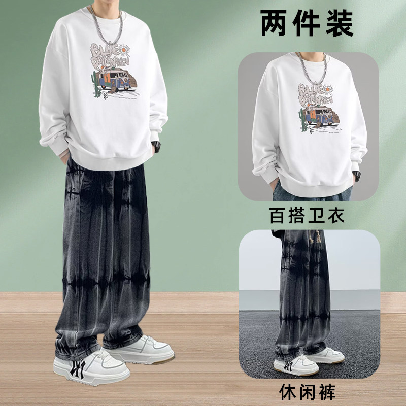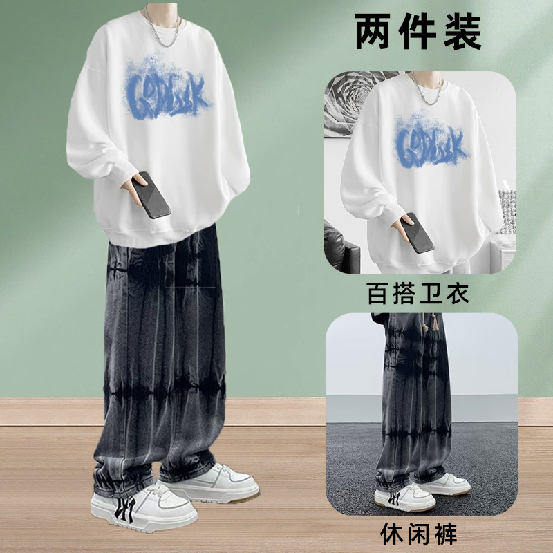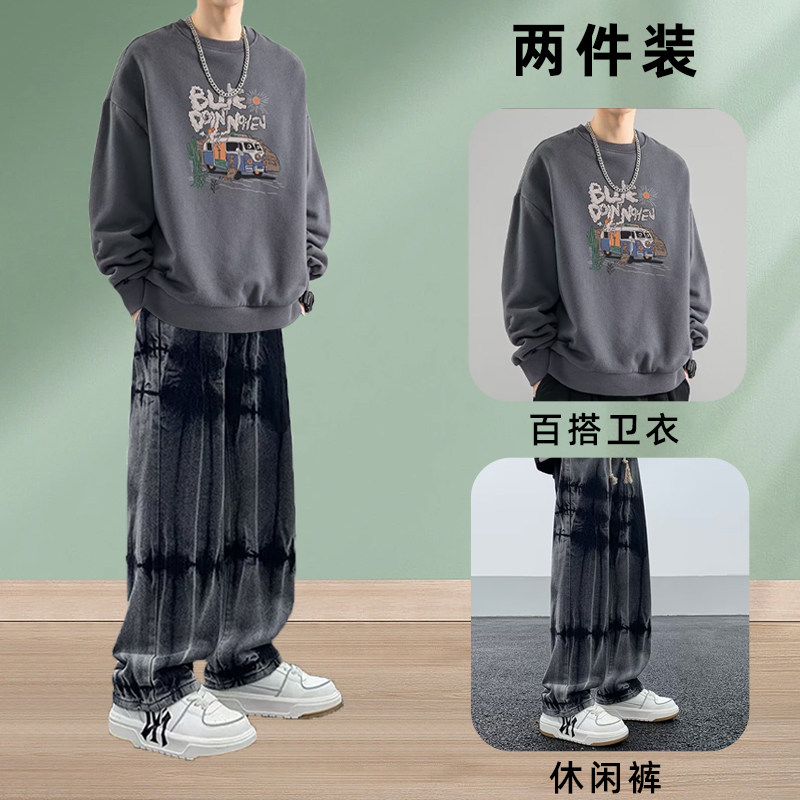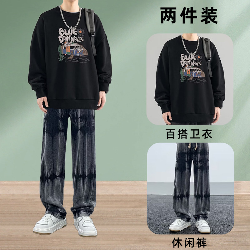 秋冬季新款潮流秋冬季圆领卫衣男装一整套搭配痞帅气牛仔裤两件套