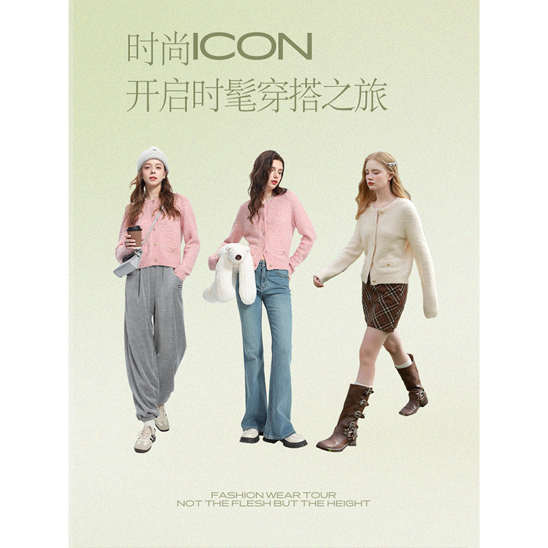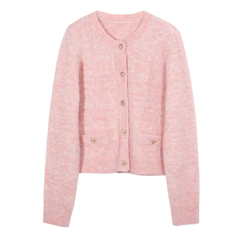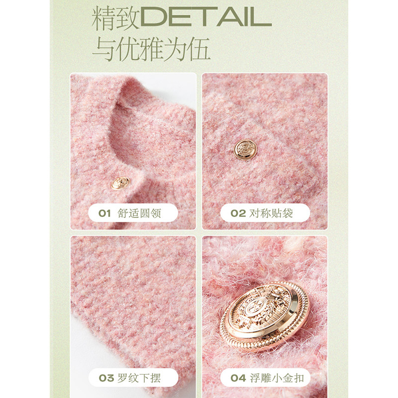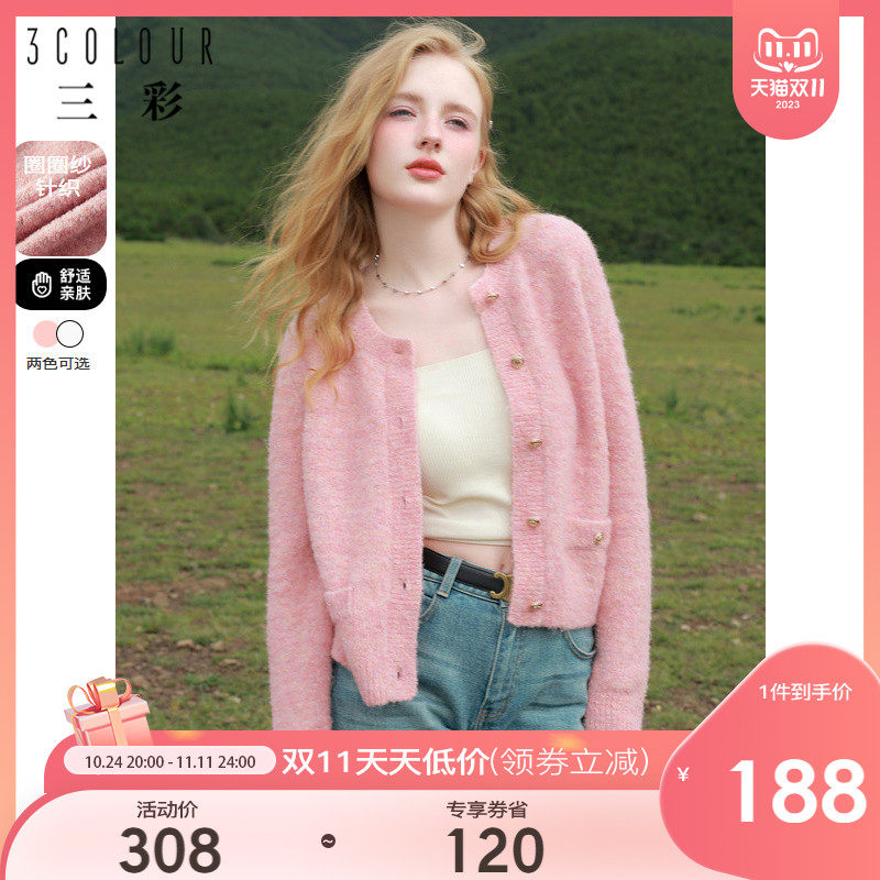 三彩2023秋冬季新款短款圈圈纱针织衫开衫粉色毛衣圆领外套上衣女