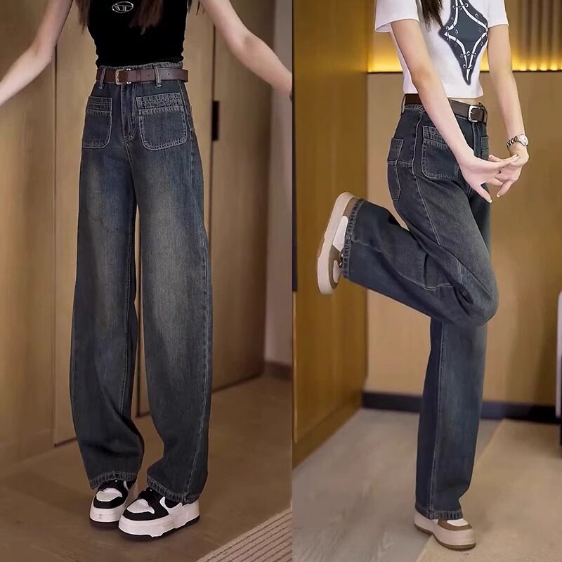 秋季新款大码女装梨型身材直筒牛仔裤显瘦胖mm高腰宽松拖地阔腿裤
