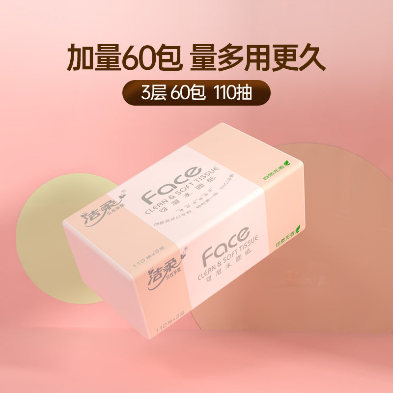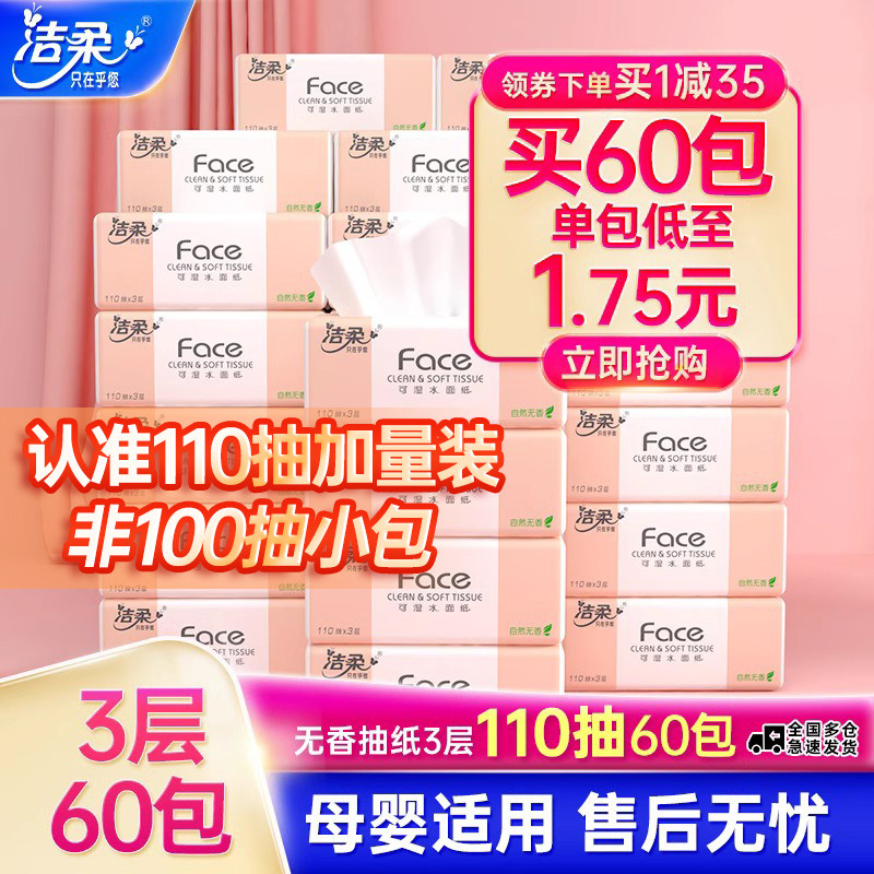 洁柔纸巾可湿水无香抽纸实惠装婴儿面巾木浆纸60包家庭实惠装整箱
