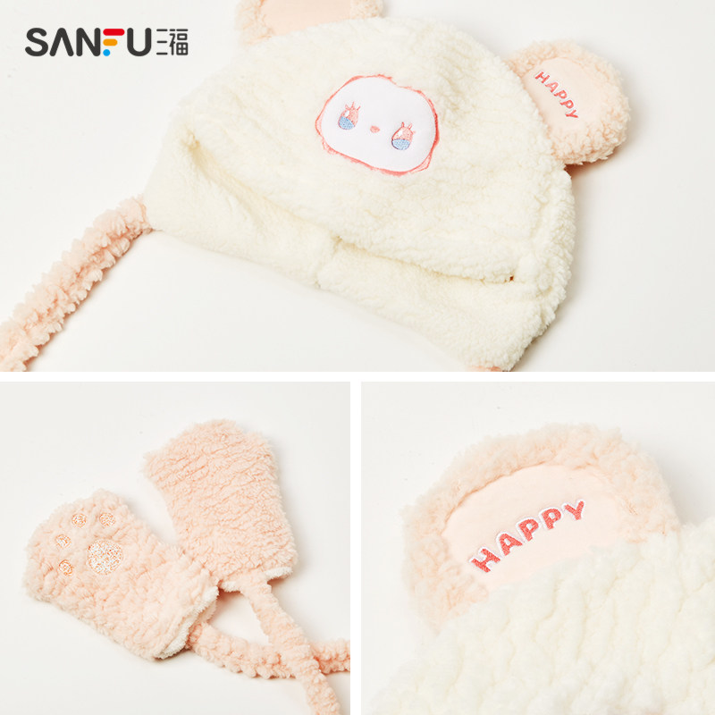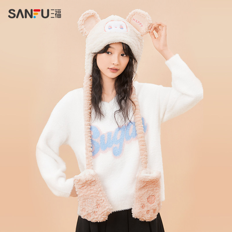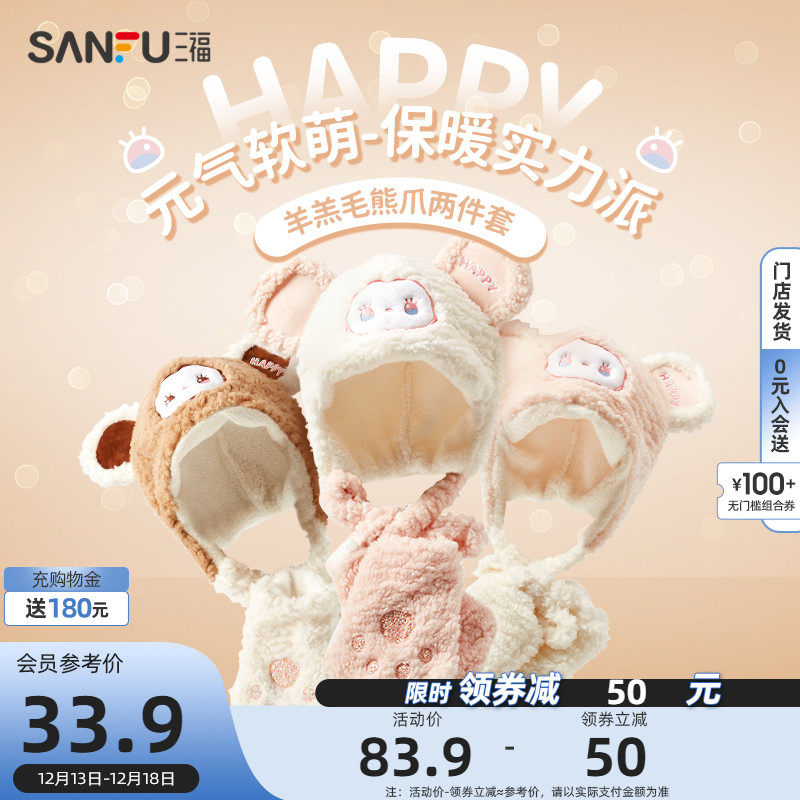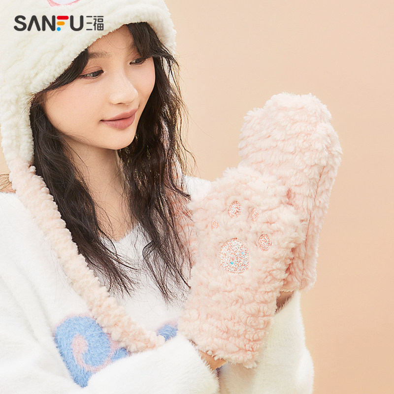 天猫三福服饰官方旗舰店,三福羊羔毛熊爪毛绒手套保暖帽子