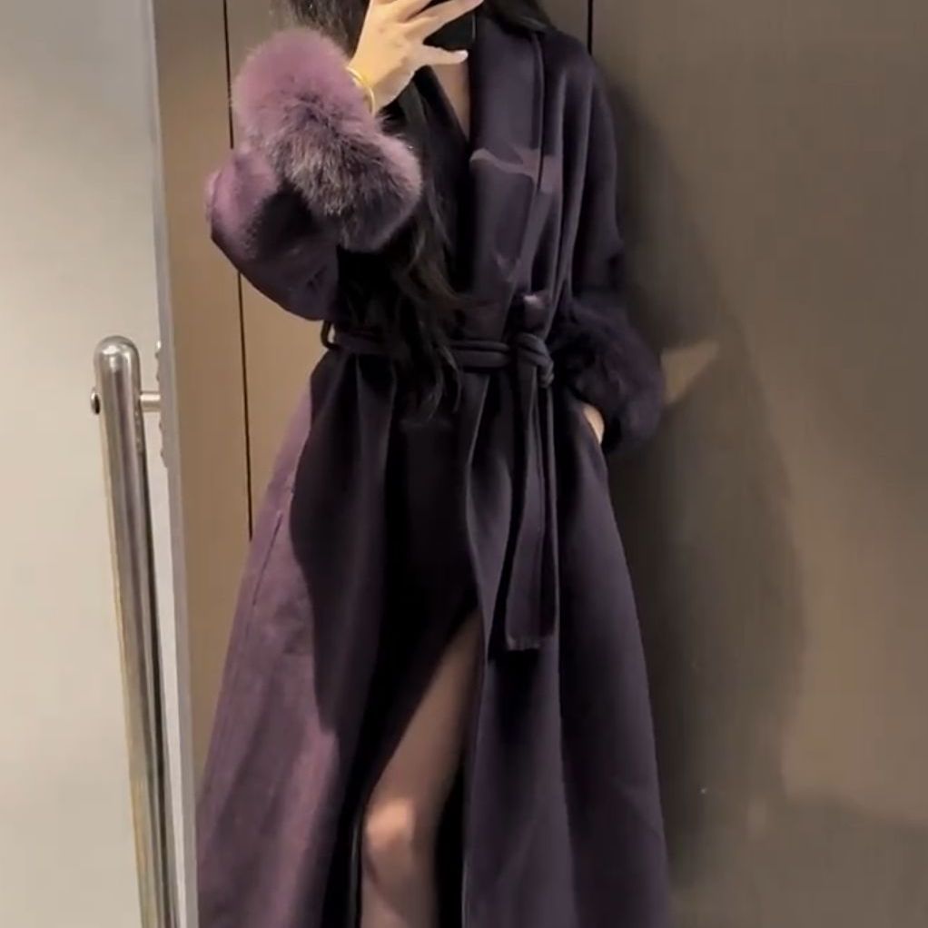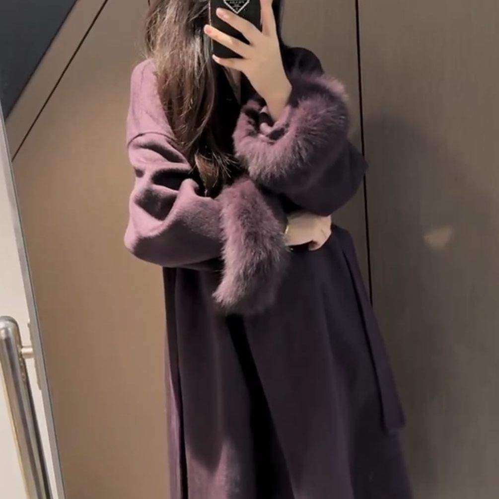 淘宝美衣秀精品女装,轻奢紫色系带收腰显瘦中长款大衣