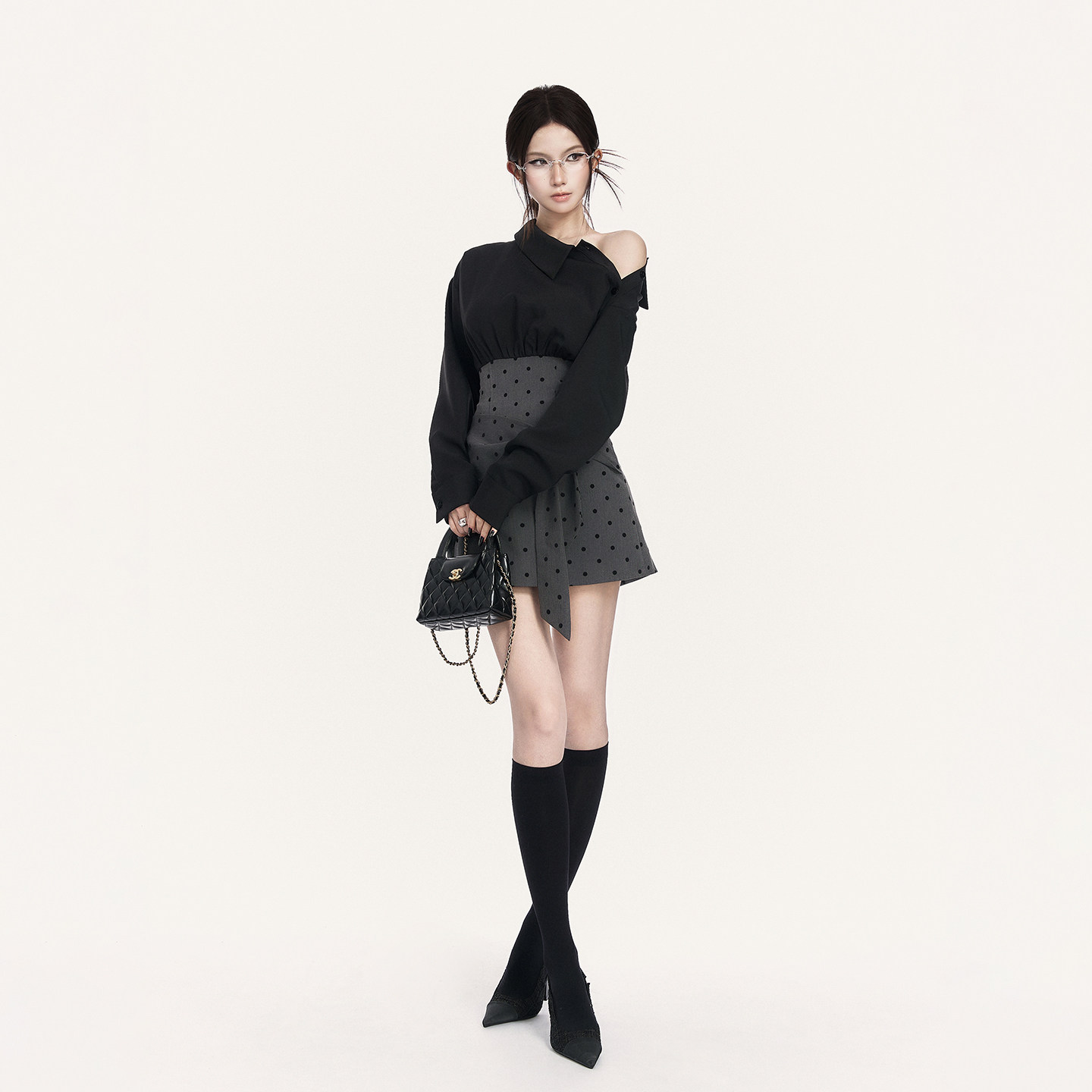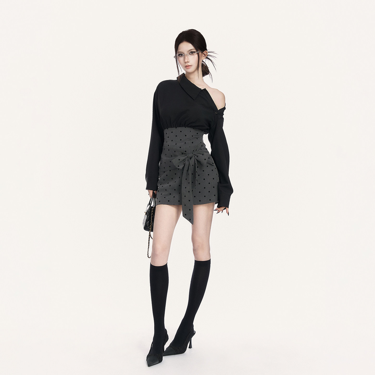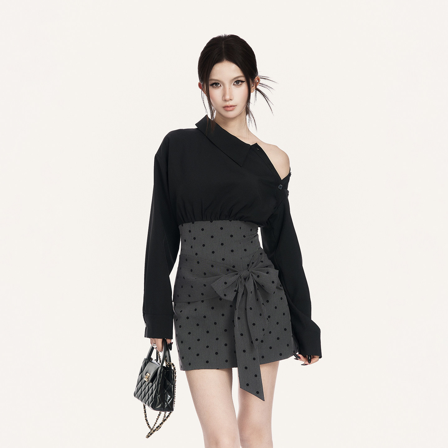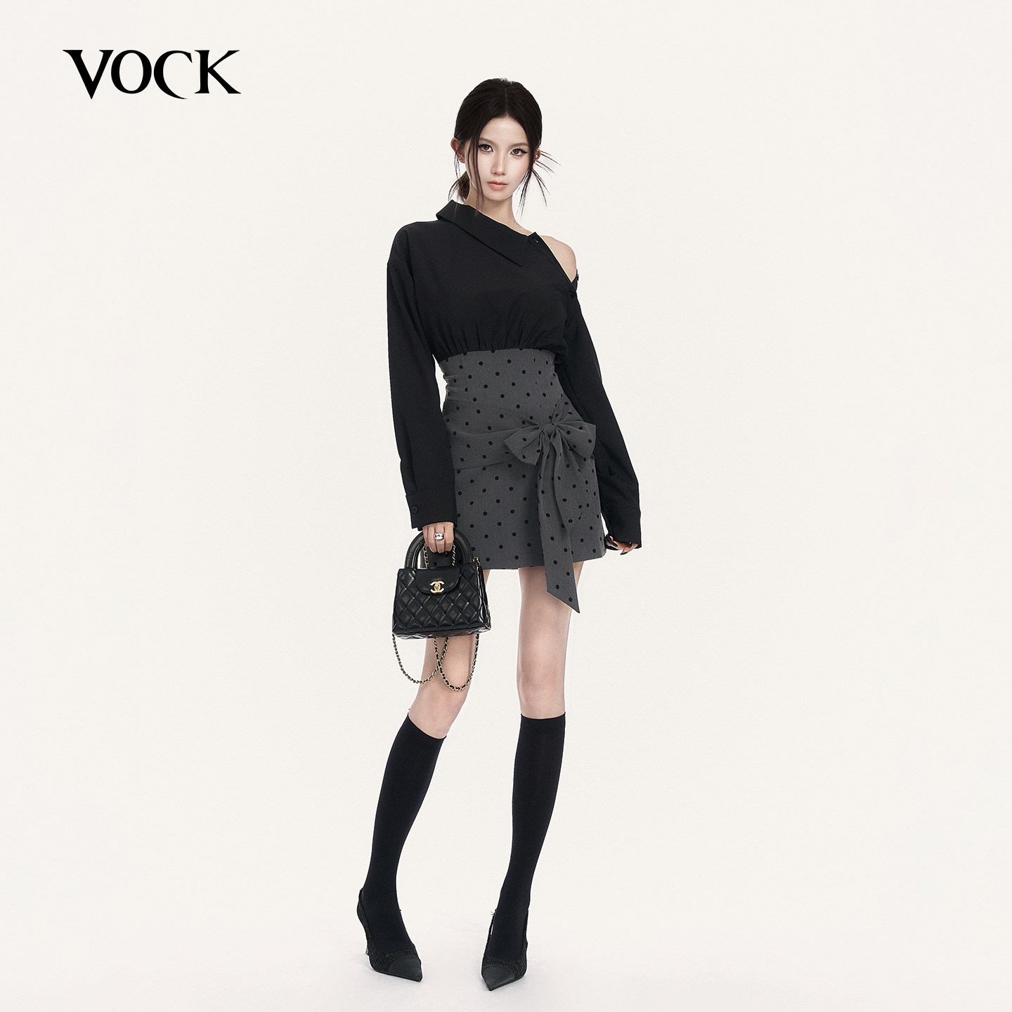 淘宝VOCK,VOCK 千金特调 法式复古蝴蝶结拼接波点露肩修身显瘦衬衫连衣裙子