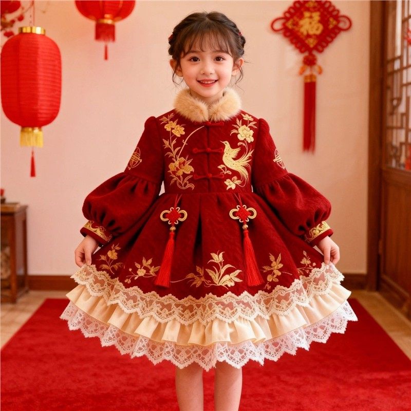 淘宝锦鲤满满汉服,女童秋冬加绒连衣裙宝宝生日喜庆洛丽塔公主裙小女孩新年装拜年服