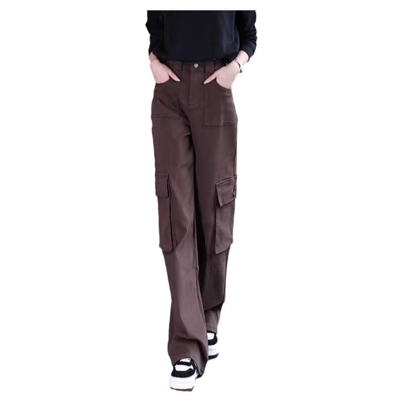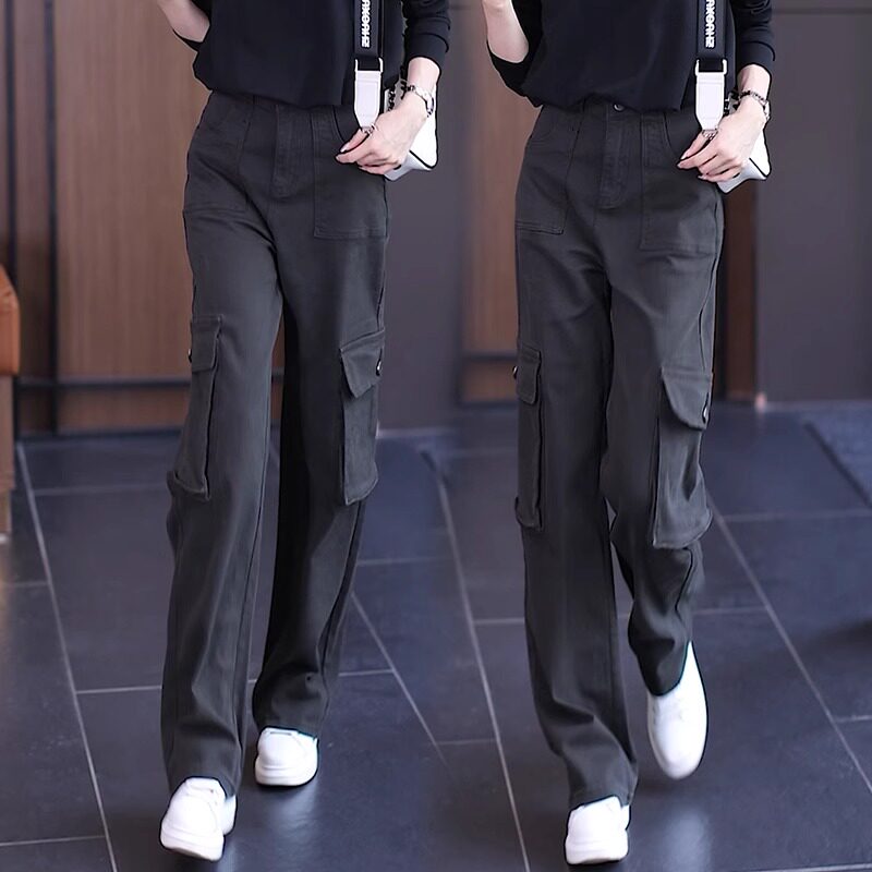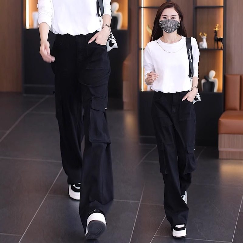 牛仔工装阔腿裤女秋冬季2023年新款高腰美式多口袋窄版直筒休闲裤